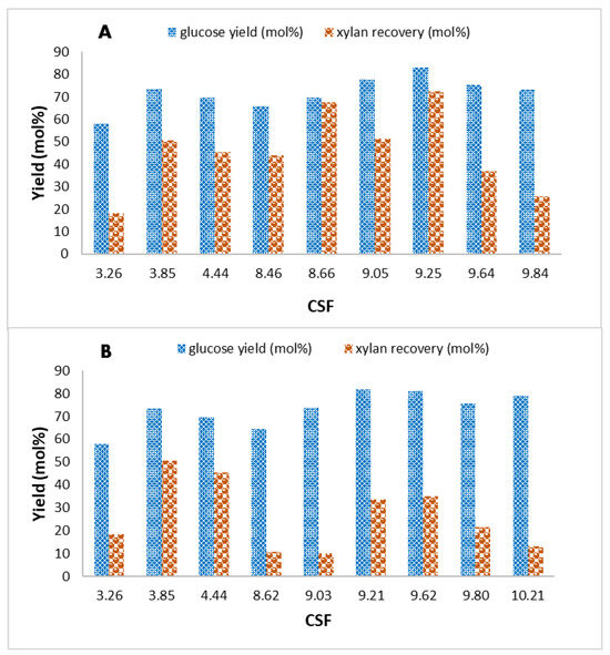 Effect of the CSF on glucose yield (mol%) after the enzymatic saccharification process and xylan recovery (mol%) under acidic (A) and basic (B) catalysis adopted in the steam explosion treatment of cardoon residue.