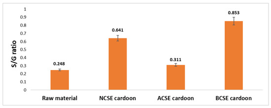 The S/G values determined for each sample, namely lignin from untreated raw material, non-catalyzed steam explosion (NCSE), acid-catalyzed steam explosion (ACSE), and base-catalyzed steam explosion (BCSE), were reported in Figure 5.