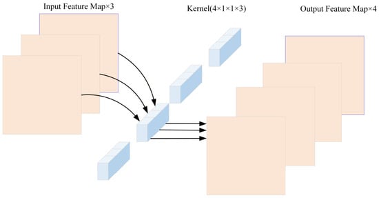 Depthwise Separable Convolution decomposes traditional convolution operations into two parts: Depthwise Convolution and Pointwise Convolution. Among them, channel-by-channel convolution is performed on each channel without changing the input feature depth, resulting in an output feature map with the same depth as the input feature map, as shown in Figure 2. Point-by-point convolution is the same as the traditional convolution operation, which uses a 1 × 1 convolution kernel to increase the dimensionality of the feature map, as shown in Figure 3. Taking a 3-channel color image with 5 × 5 pixels as an example, when performing depthwise separable convolution using 3 × 3 × 4 convolution kernels, the theoretical computational cost is 675 when convolving channel by channel; When convolving point by point, the theoretical computational cost is 3 × 4 × 5 × 5 = 300, and the total theoretical computational cost is 675 + 300 = 975. When using traditional convolution operations, the theoretical computational cost is 2700, which is about three times that of depthwise separable convolution. Therefore, when constructing lightweight fault diagnosis models, replacing traditional convolution operations with depthwise separable convolution can achieve fewer parameters and computational complexity.