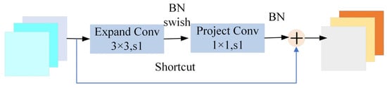 The EfficientNet V2 network model was proposed by Tan et al. in April 2021 [26]. In the original Efficient V1 version, MBConv (Depthwise Separable Convolution) in shallow networks was replaced with Fused-MBConv, and NAS was used to search for the best combination. At the same time, the amplification factor of 1 × 1 convolution kernel in each module was reduced to form a faster and smaller convolutional neural network model, which can effectively reduce parameters and improve the efficiency of model training. The MBConv module is shown in Figure 4.