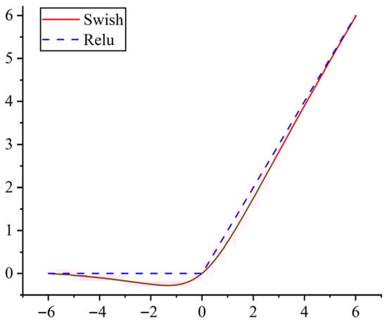In order to improve the nonlinear expression ability of the neural network model, the neural network model can approach the nonlinear model, and the activation function is introduced to improve the expression ability of the network model. As shown in Figure 8, the most widely used activation function in neural network models is the Relu activation function shown in Equation (1). Although the calculation amount of the Relu activation function is small, it can effectively alleviate such problems as gradient loss, but when the value of the input activation function is negative, the neuron will be directly necrotic, causing the loss of this part of the feature information. The Swish activation function shown in Formula (2) has the characteristics of non-monotonicity, unsaturation, and smoothness compared with the Relu activation function, which can effectively solve the neuronecrosis caused by the Relu function.