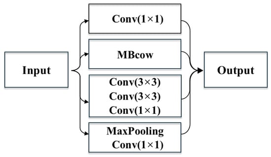 As a classic convolutional neural network model, InceptionNet is most characterized by the expansion of the convolutional operation in each layer of the neural network. The expanded convolutional layers conduct feature extraction and pooling operations at different scales, thereby acquiring feature information at multiple scales. Eventually, the feature information at various scales is integrated through a concatenation operation. The introduction of the InceptionNet network not only improves the classification performance of the network but also reduces the computational cost while maintaining the model quality. In this study, the InceptionV2 module is employed, where the 5 × 5 convolutional kernel in the convolutional layer is replaced by two 3 × 3 convolutional kernels, as specifically depicted in Figure 7.