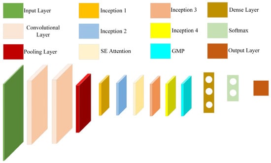 The multi-scale convolution model constructed in this study first performs feature extraction on the input through two sets of convolutional layers and then reduces the feature dimension through the Max pooling method to extract the main feature information. Then, through Inception1 and 2 modules, feature extraction and pooling at different scales are carried out. Subsequently, through the SE attention mechanism, the information of each channel is learned to obtain the weight coefficients between channels, thereby further extracting the main features. Then, by utilizing the Inception3 and 4 modules, mainly based on depthwise separable convolution, high-dimensional features are extracted while reducing the number of computational parameters. Finally, the high-dimensional features are compressed and aggregated through the global average pooling layer, converting the feature mapping into a fixed-dimensional vector representation. Subsequently, a fully connected layer is added to deeply integrate and perform nonlinear transformation on this vector feature, further enhancing the discrimination of key fault features and screening redundant information. Finally, the fault diagnosis type of the bearing is obtained through the SoftMax classifier. The detailed network architecture is illustrated in Figure 11.