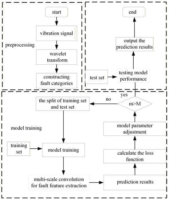 Against the backdrop of industrial big data, traditional fault diagnosis methods for rolling bearings rely heavily on expert experience and signal processing techniques [7,8]. These methods are prone to introducing human errors during data processing and feature extraction, and they lack sufficient generalization, thus exhibiting significant limitations [9]. In contrast, deep-learning-based rolling bearing fault diagnosis models [10], with their robust data processing capabilities and adaptive feature learning abilities, reduce the technical demands placed on inspection personnel and are better suited for analyzing vast amounts of high-dimensional data [11,12]. Guan et al. [13] proposed a multi-information rolling bearing state prediction fusion and autoencoder modeling approach. This method analyzes and processes the vibration signals of rolling bearings, extracts and fuses multi-information entropy, and experimentally verifies the monitoring of rolling bearing operational status and predicts the remaining useful life (RUL). Tang et al. [14] introduced a novel diagnostic model, GL-mRMR SVM, based on feature fusion and feature selection, which enhances the effectiveness of bearing fault diagnosis. Qing Li [15] proposed a smoothed sparse low-rank matrix (SSLRM) method associated with an asymmetric singular value decomposition (SVD) penalty regularizer, which improves the extraction effectiveness and diagnostic accuracy of transient pulse signals from rotating machinery fault vibration signals. Zhou Zhiyong [16] introduced a fault diagnosis method for the outer ring of ship motor bearings, utilizing vibration acceleration resonance demodulation spectrum analysis and employing vibration acceleration kurtosis coefficient and vibration velocity root mean square (RMS) value as indicators, which enhanced the effectiveness of fault diagnosis for asynchronous motor bearings. Yu et al. [17] proposed a novel approach for constructing health indicators (HIs) and a transfer learning prediction framework that integrates convolutional neural networks (CNNs), gated recurrent units (GRUs), and multi-head attention (MHA), significantly improving the accuracy of remaining useful life (RUL) prediction for rolling bearings. Yang Yu et al. [18] optimized the deep belief network, effectively reducing model training time, accelerating convergence speed, and achieving high fault identification accuracy. Xue Yan et al. [19] developed a one-dimensional convolutional neural network to directly input raw bearing vibration signals into the model, enabling an end-to-end diagnostic process from data to results. Hu Xiaoyi et al. [20] incorporated batch normalization and dropout techniques into traditional convolutional neural networks, combined with a support vector machine classifier, to construct a CNN-SVM fault diagnosis model, thereby enhancing the model’s generalization ability and convergence speed. Zhou Qifan et al. [21,22,23] adopted the YOLOv8 architecture as the backbone and introduced a Dilated Reparameterization Block (DRB) to enhance the Dilated Residual Block (DWR), thus constructing a model that integrates signal representation with image information. This model is designed for multimodal mechanical wear fault diagnosis, which improves the reliability and efficiency of detection in practical applications. Yuan Laohu et al. [24] transformed bearing vibration signals into vibration signal graphs as network inputs and employed transfer learning within the classic AlexNet architecture to reduce training parameters, achieving high fault recognition accuracy. Zhang Xining et al. [25] employed small-scale convolutions with a stride length of 2 as a substitute for downsampling operations, thereby minimizing the substantial information loss incurred during downsampling, enhancing the diversity of feature maps, attaining higher accuracy, and shortening network training time. While existing methods have demonstrated commendable performance in the realm of bearing fault diagnosis, they predominantly focus on automatically extracting single-scale features from raw vibration signals, overlooking crucial information embedded in vibration data of other scales, which often results in suboptimal diagnostic outcomes.