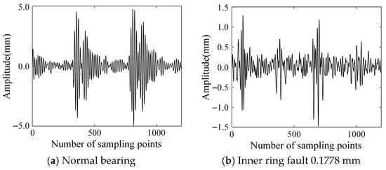 In this experiment, the bearing data at the driving end is adopted, and the sampling frequency is 48 kHz. According to different parts of the bearing and the varying degrees of single-point damage at each bearing part, a total of 10 types of states are set according to different parts of the bearing and different degrees of single-point damage at each bearing part. Each type of state is subject to continuous wavelet transformation. A total of 4000 training set samples, 500 verification set samples, and 500 test set samples are set according to the ratio of 8:1:1. At the same time, in order to avoid overfitting, the input images are randomly turned over, randomly cut, and mirror turned over. Time-domain images of a bearing with a damage diameter of 0.1778 mm at 0 horsepower are shown in Figure 13 and Figure 14.