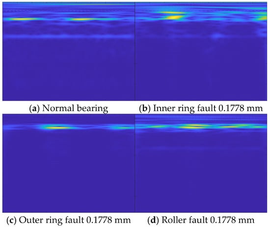 - The model can automatically extract different features from the time–frequency diagram, reduce the requirements of manual bearing fault diagnosis, and accurately classify different bearing faults.