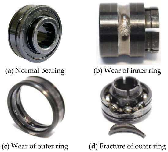 In this experiment, five types of bearing vibration signals are selected from the three types of working conditions as the test objects, including four types of fault characteristics, i.e., inner ring wear, outer ring wear, outer ring fracture and overall bearing failure, and normal bearing, as shown in Figure 17.