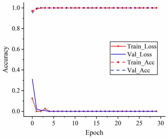 In order to further verify the stability of the model, the model was repeated 10 times, and the experimental results are shown in Table 4. The results show that the proposed model can quickly converge, has good stability, and can accurately distinguish different bearing faults, so it is more suitable to be applied in engineering practice in cases with limited data.