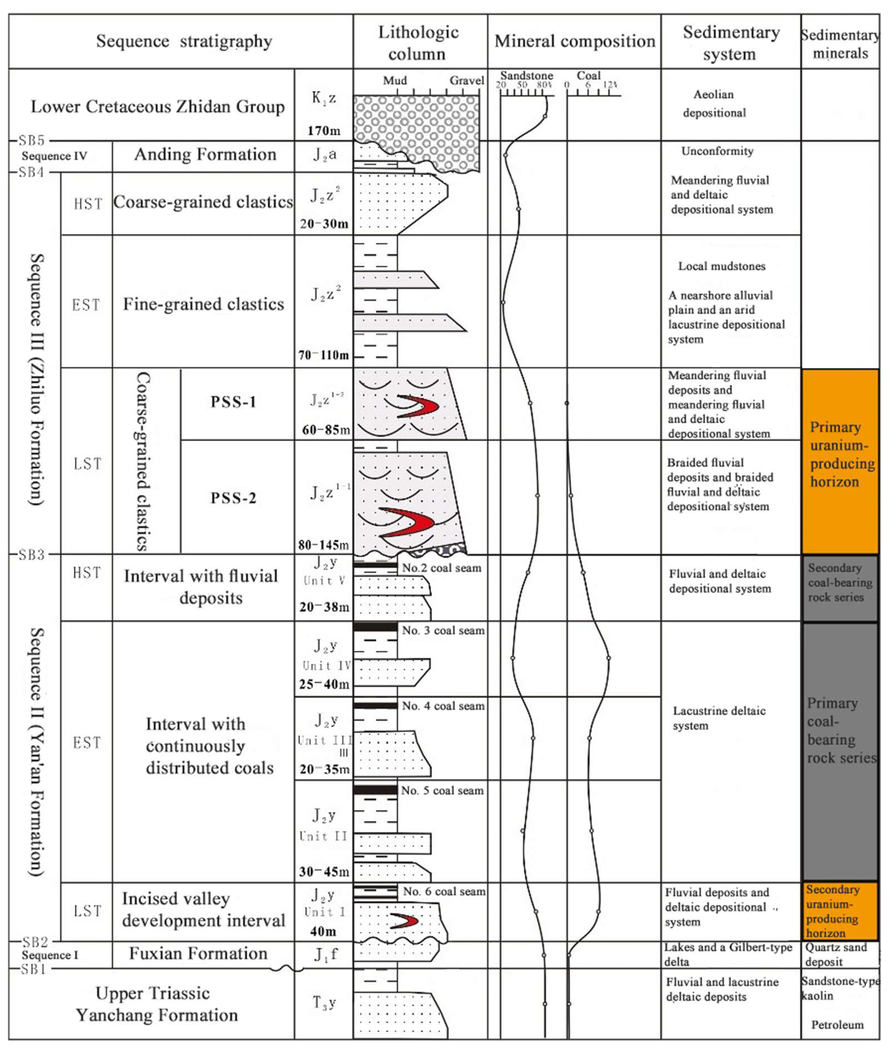 - Yang, R.; Han, Z.; Liu, Y.; Fan, A. Relationship between Jurassic Coal Measures and Uranium Deposits in Dongsheng Area, Ordos Basin. J. Earth Sci. Environ. 2006, 4, 31–37. [Google Scholar]