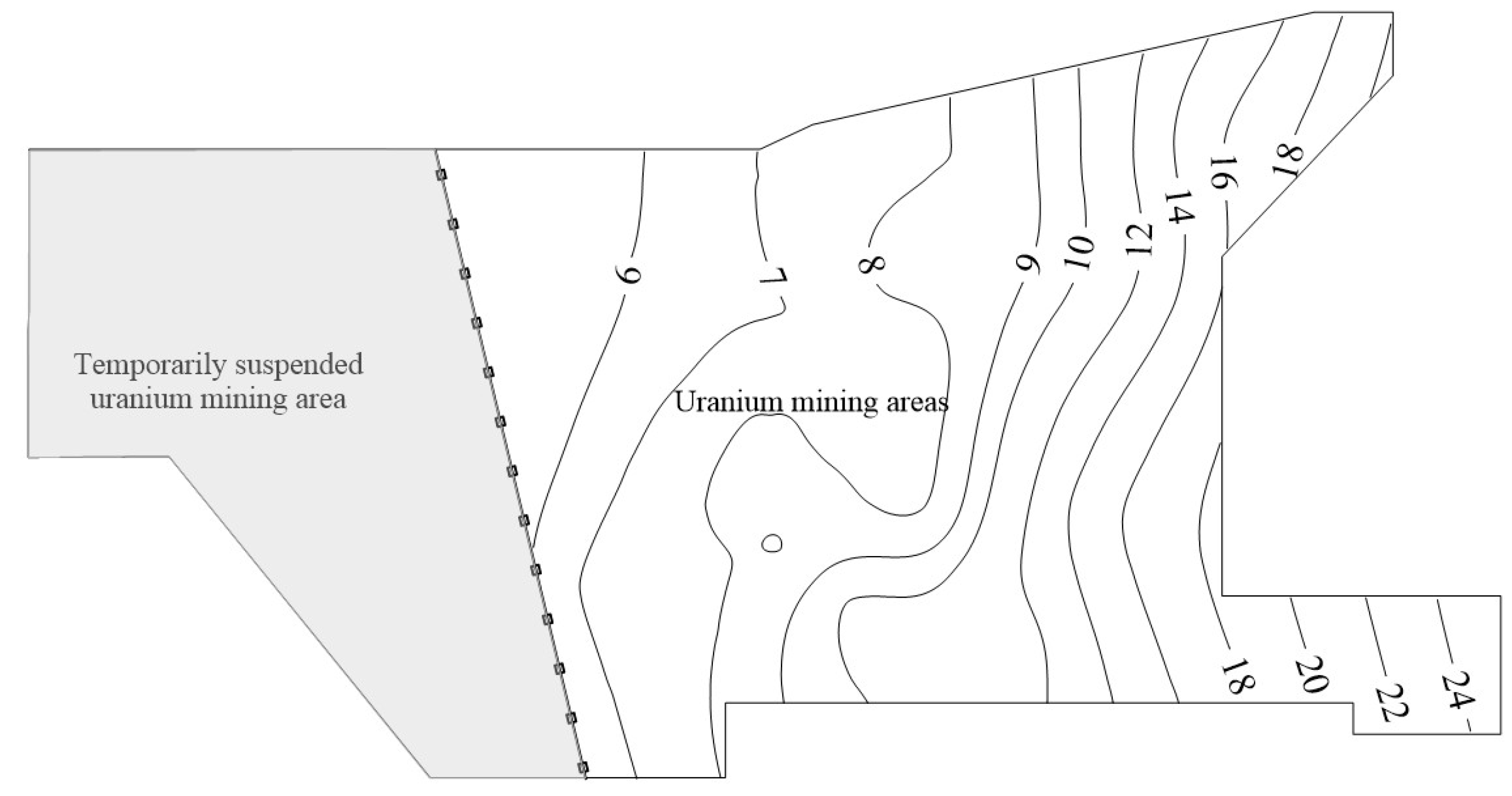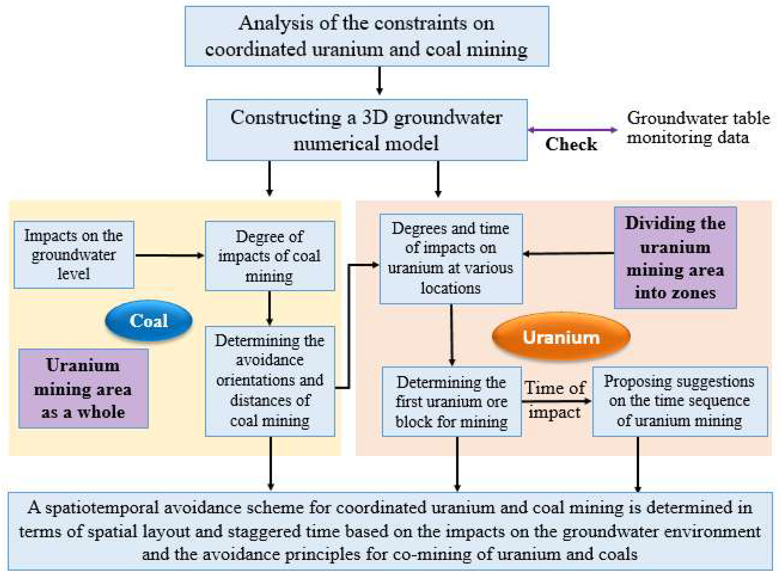 - Considering the overlapping and coexisting uranium and coal resources in the Tarangaole mining area, this study proposes an avoidance scheme for coordinated mining of uranium and coal based on temporal and spatial aspects. Specifically, by staggering the locations and time sequences for uranium and coal mining, this scheme reduces the mutual impacts of uranium and coal mining to acceptable levels.
