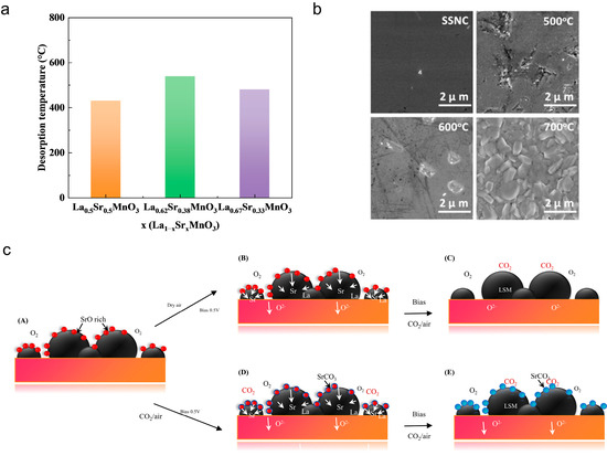 (a). Desorption of CO2 from La1−xSrxMnO3−δ annealed in air. Redrawn from Ref. [54], (b). Scanning electron microscopy (SEM) images of the surface of (a) SSNC-D and (b) BSCF-D before and after CO2 treatment at 500, 600, and 700 °C. Reproduced with permission from Ref. [61]. (c). Schematic of the mechanisms of CO2 interaction with LSM and related electrochemical performance. A: as-fabricated LSM cathode; B: SrO incorporation into the LSM lattice; LSM activation in dry air. C: No more SrCO3 formation at the LSM surface due to absence of SrO; stable electrochemical performance; D: partial incorporation of SrO into the LSM lattice and formation SrCO3 at the LSM surface; limited activation and performance degradation, E: increased SrCO3 on the surface and subsequent performance degradation; an illustration from Ref. [62].