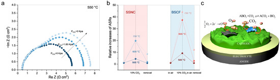 Although the CO2 tolerance of perovskite cathodes is primarily governed by the elemental composition at the A/B-sites, the operating temperature also serves as a critical variable significantly impacting the performance. As shown in Figure 5a, Zhao et al. [47] investigated the CO2 tolerance of the La0.6Sr0.4CoO3−δ (LSC) cathode at different temperatures. The adsorption behavior in the low-temperature range (550–650 °C) accords with the Temkin model, while at a higher temperature range (700–800 °C), the model conforms to the Freundlich model. Notably, under constant CO2 partial pressure (e.g., 1.85 kPa), the increase in polarization resistance rises exponentially with decreasing temperature: only a 0.01 Ω cm2 increase at 700 °C, rising to 0.21 Ω cm2 at 600 °C, and surging to 1.20 Ω cm2 at 550 °C. This temperature effect is further reflected in the significantly higher rate of change in the area-specific resistance (ASR) with increasing CO2 partial pressure observed in the low-temperature range compared to the high-temperature range. Zhang et al. [61] studied the CO2 tolerance of SSNC and BSCF cathodes in atmospheres containing 10 vol% CO2 at 500–700 °C, as shown in Figure 5b. After exposure to 10 vol% CO2 at 500 °C and 600 °C, the relative increase rate of ASR reached 20–45 times, whereas at 700 °C, the relative increase rate was only 4–9 times. Furthermore, after CO2 removal from the atmosphere, the electrochemical performance of cathodes tested at 700 °C fully recovered within 15 min, while no complete recovery was observed for cathodes tested at 500 °C and 600 °C.