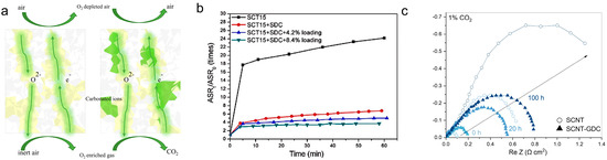 (a). Diagrams of the novel concept for CO2-tolerance oxygen-permeable dual-phase membranes. Redrawn from Ref. [93]. (b). Relative ASR value changes with time for the studied cathodes when the flowing air is replaced by flowing 10% CO2-containing air at 550 °C. Reproduced with permission from Ref. [94]. (c). Electrochemical impedance spectra evolution during 100 h test at 550 °C in 1 vol % CO2-containing air for SCNT and SCNT-GDC cathode. Reproduced with permission from Ref. [96].