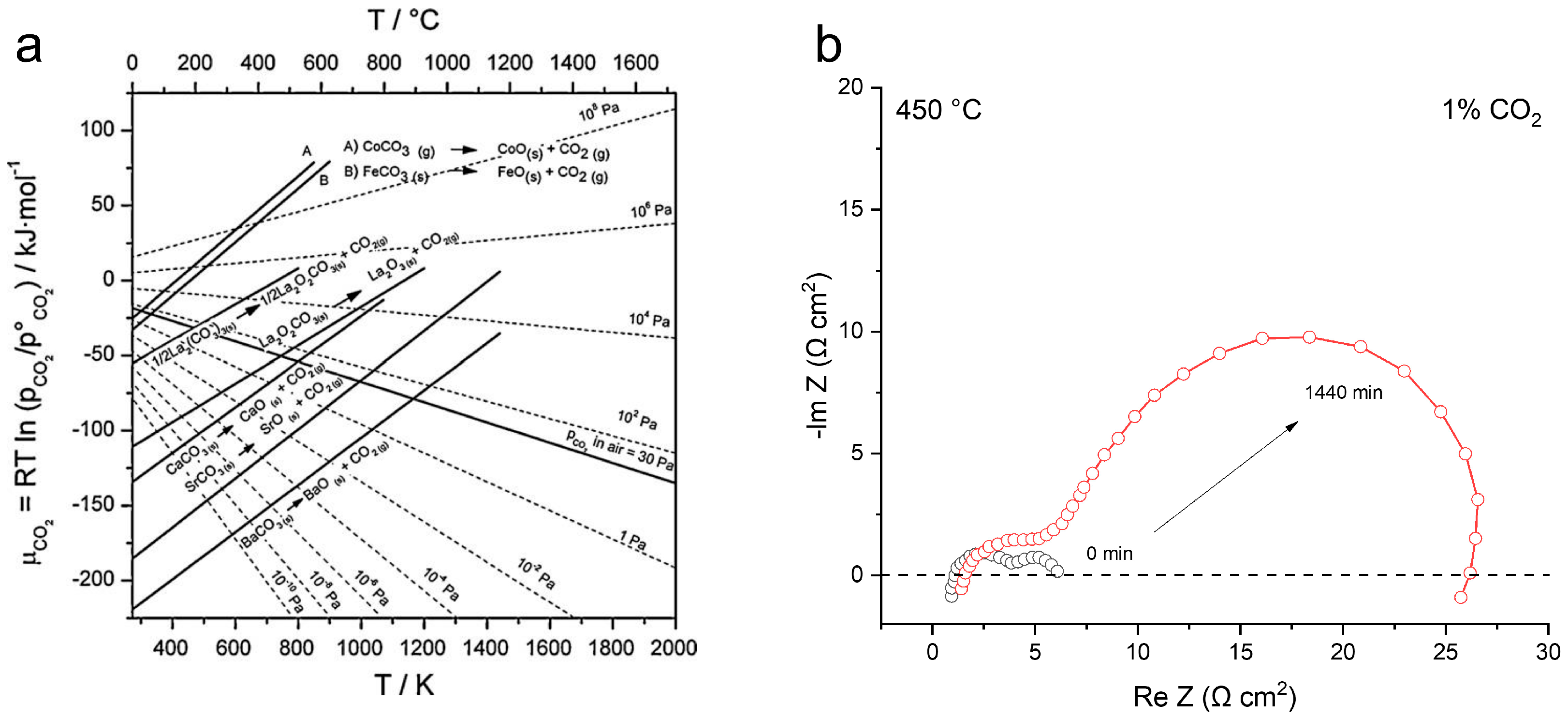 | Material | Temperature (°C) | CO2 (vol%) | Time (h) | Impedance: Start to End |
