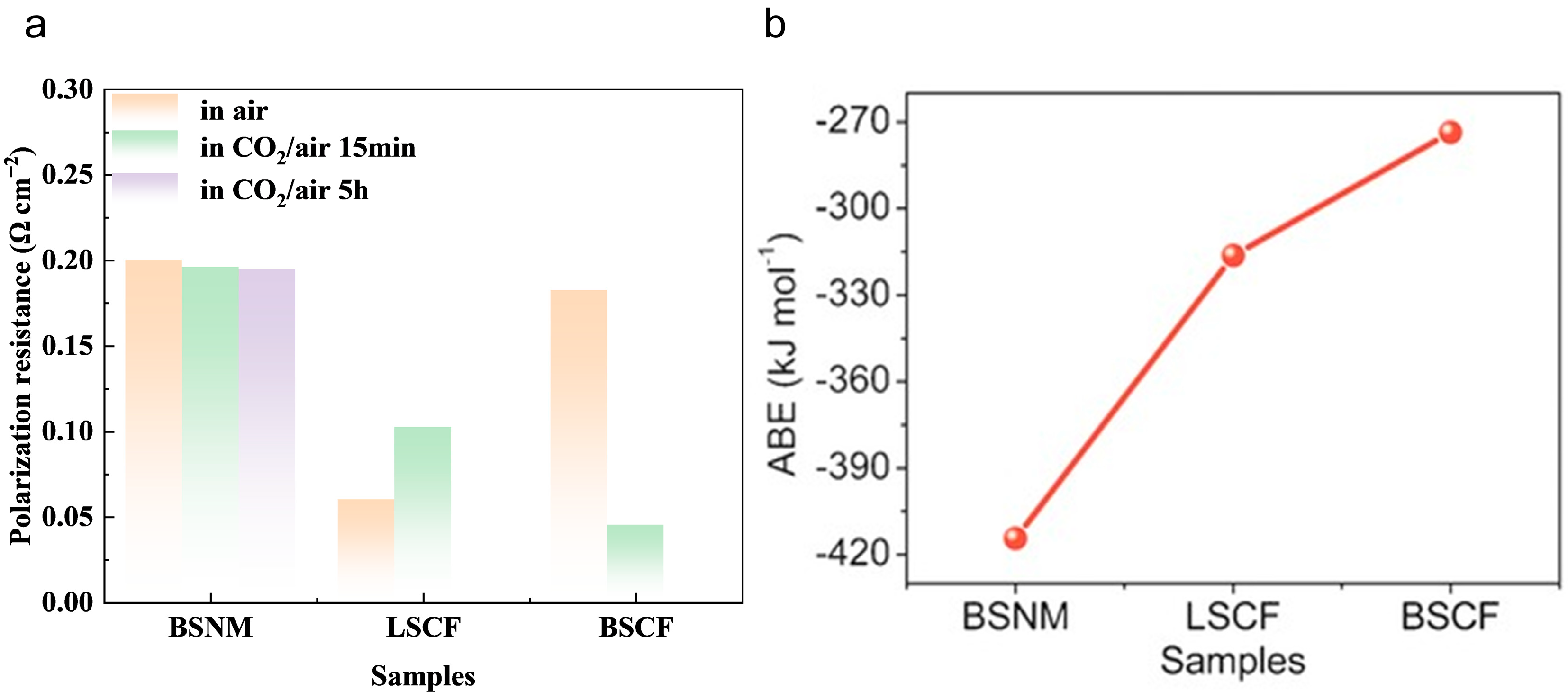 - Construct material systems with high ABE values. The value of ABE can be well used to evaluate the priority of carbonation reactions and thus can reflect the tolerance of the perovskite system to CO2. Priority should be given to developing material systems with high ABE values. For instance, by introducing elements such as Fe, Ti, and Zr to strengthen the B-O bond, the chemical adsorption of CO2 and the formation of carbonates can be inhibited. It is also expected to synthesize materials with high CO2 resistance.