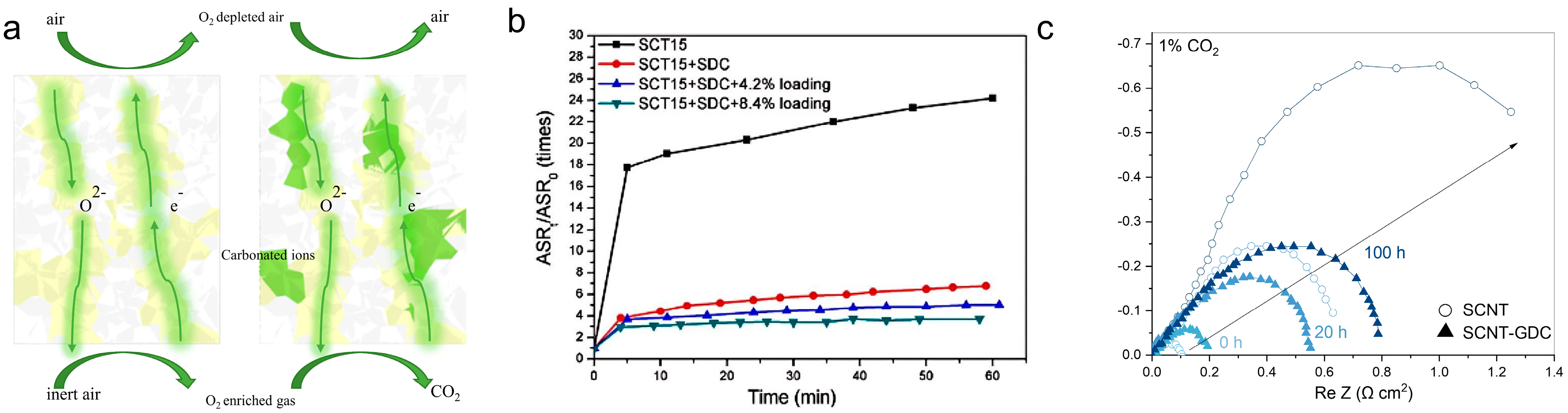 | Composite cathodes (e.g., SDC/GDC) | Dilutes Ba/Sr exposure and supplies stable ORR sites; microstructural/interface buffering against CO2 | Simple | Drop-in friendly (mixing/light infiltration); fast, tunable gains via phase ratio/porosity control; maintains ORR while improving CO2 robustness | Must ensure phase/TEC compatibility; potential interdiffusion/interface reactions over long operation if co-fired |