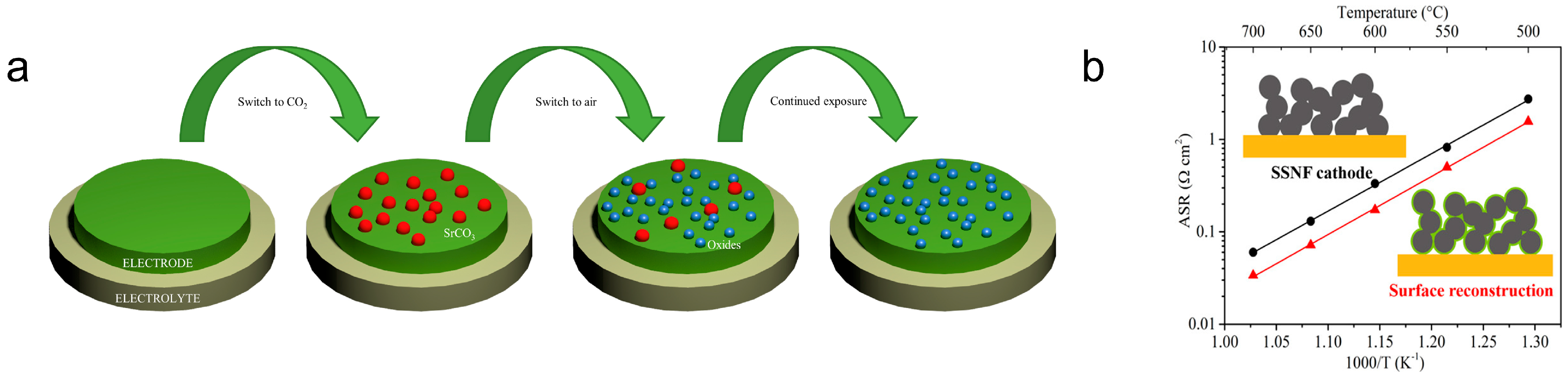 | Surface infiltration/coating | LSM/LNO/BCO nano-layers tune adsorption/exchange and transport; shield susceptible sites | Moderate | Retrofittable to existing electrodes; fine surface control; targeted suppression of CO2 adsorption/carbonates | Performance hinges on thickness/uniformity/durability; excessive layers add resistance |