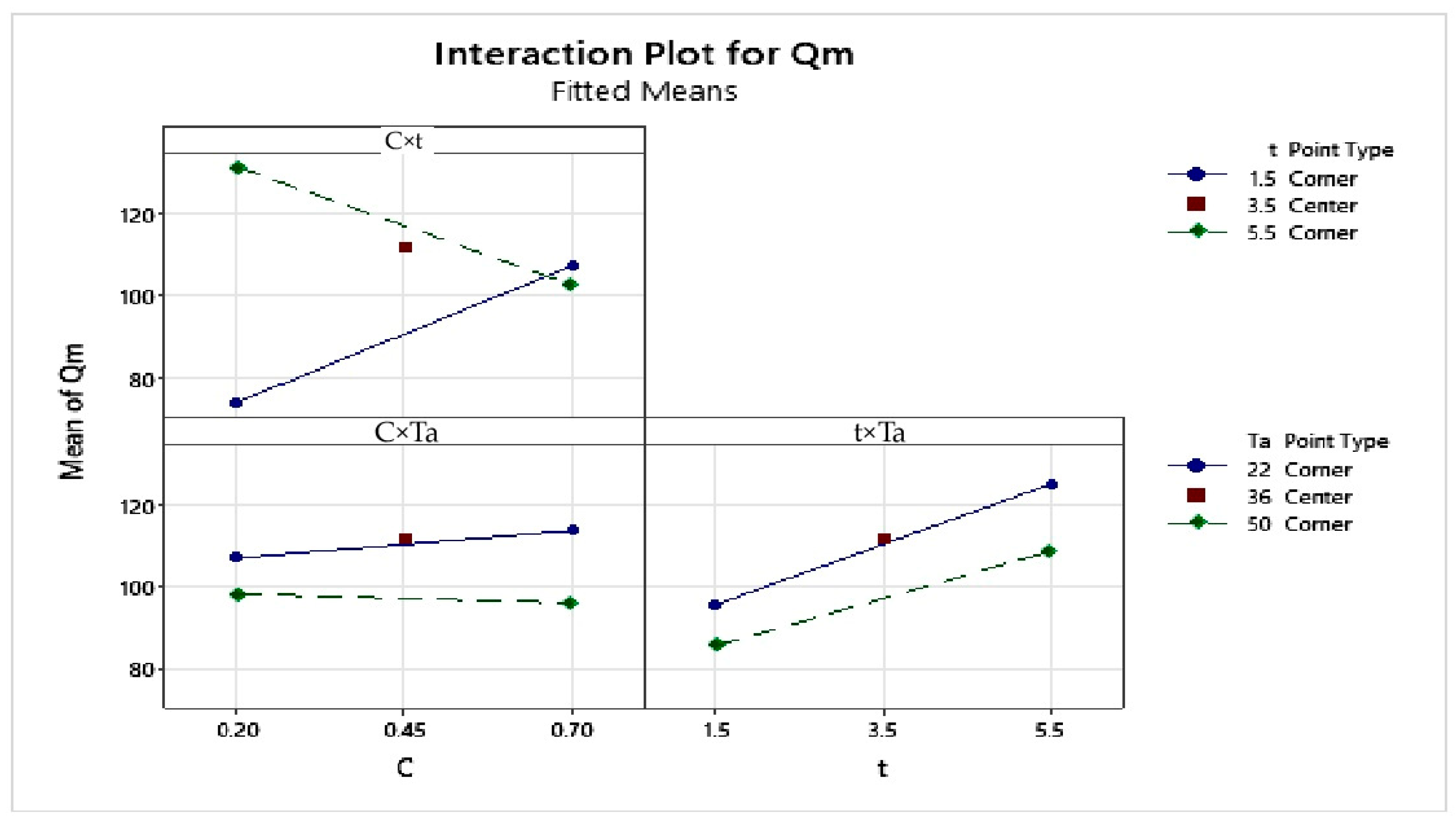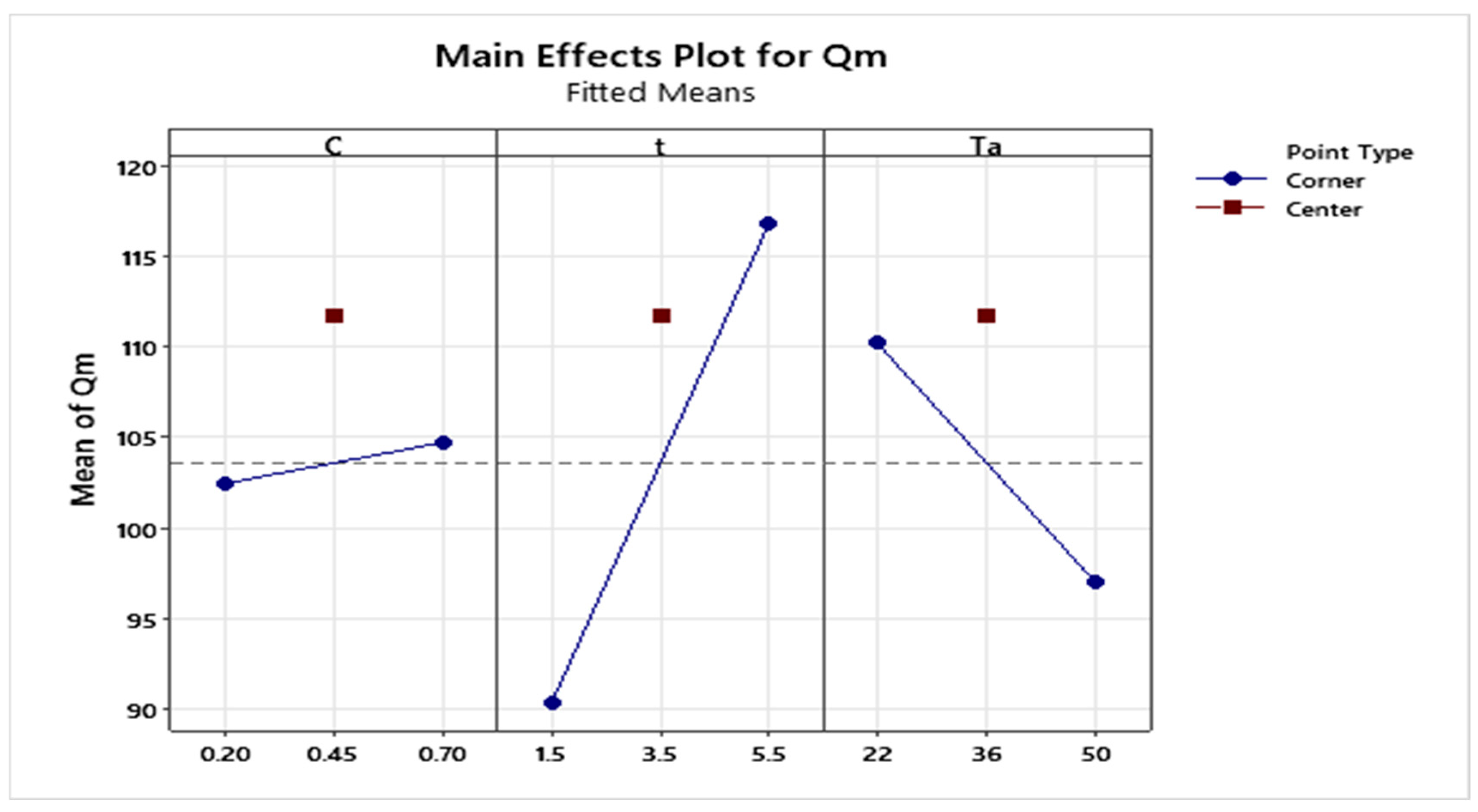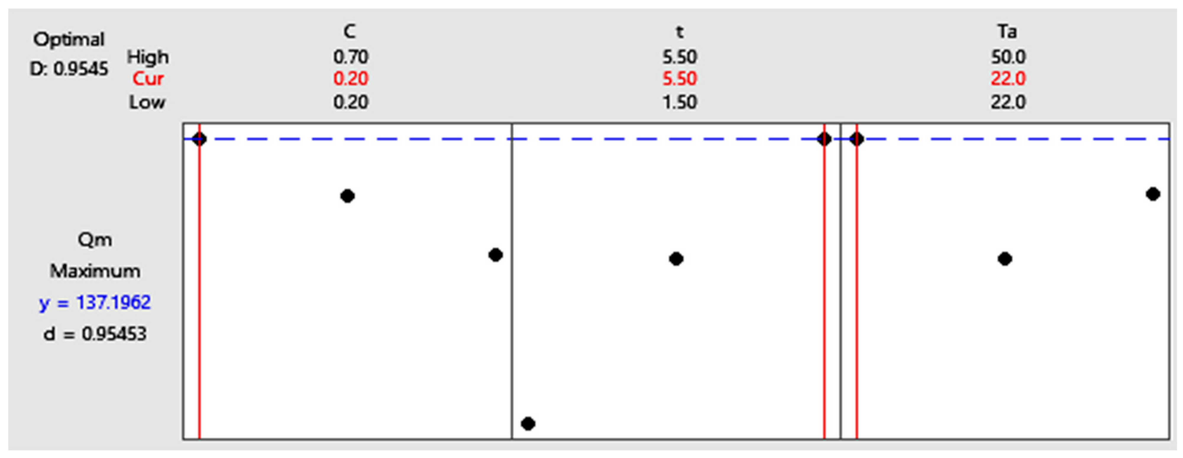 | Factors | Responses Qm (mg·g−1) | |||||||