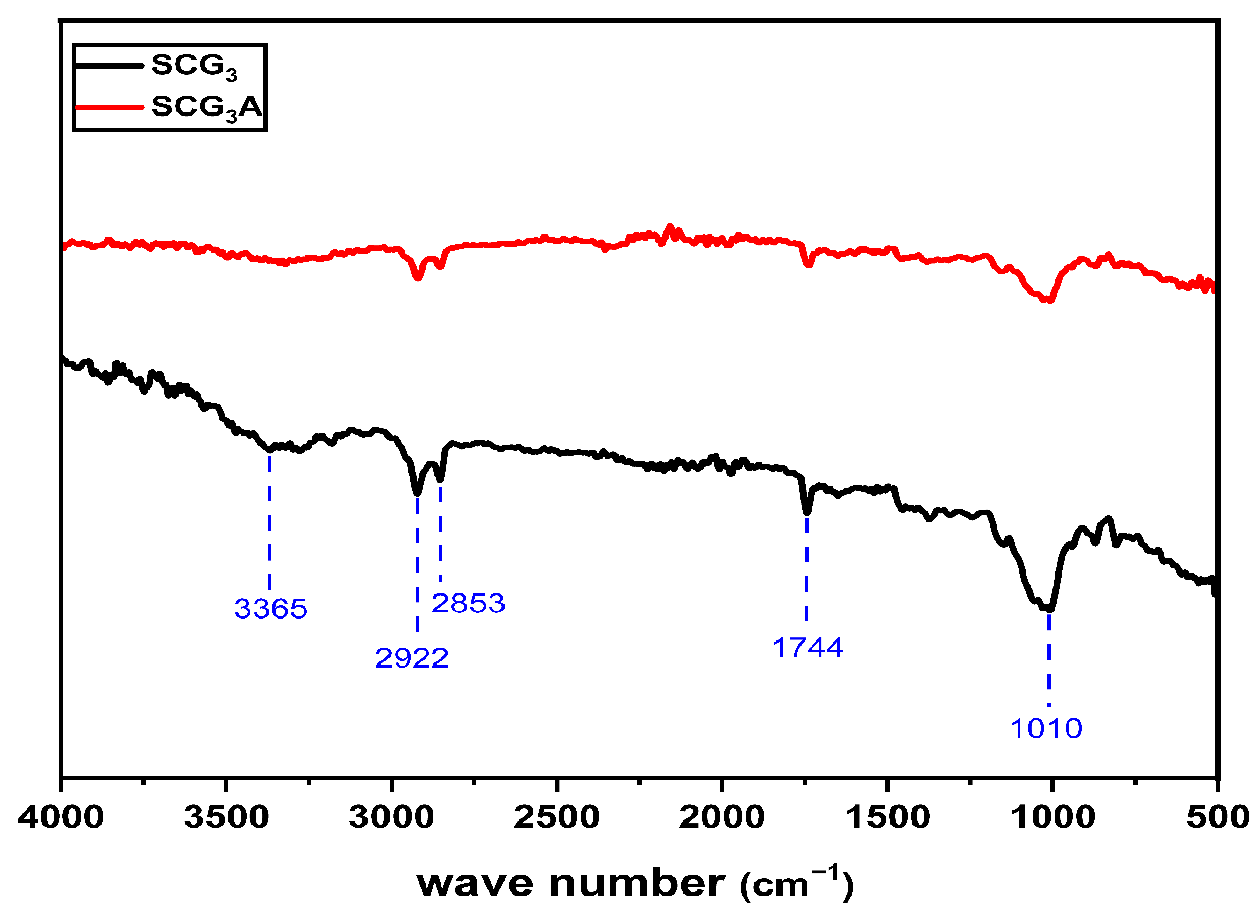 | 3365 | 3600–3300 | O–H stretching vibrations of Hydroxyl (carboxylic acids, alcohols and phenols) and O–H stretching vibrations of cellulose, pectin, absorbed water and lignin [40,41,42] |