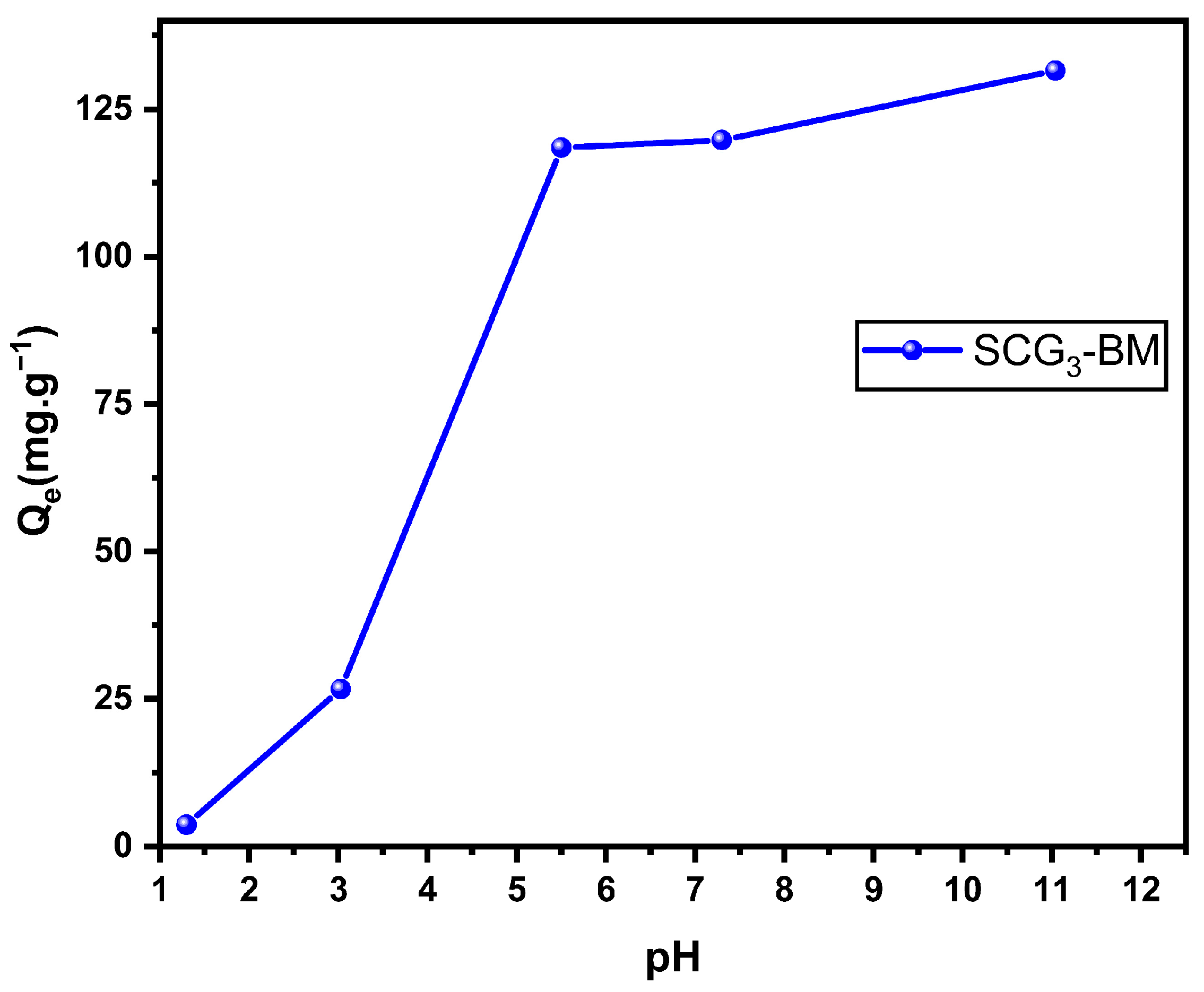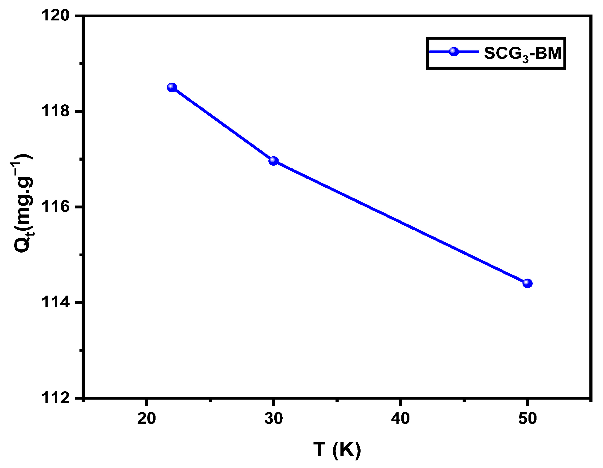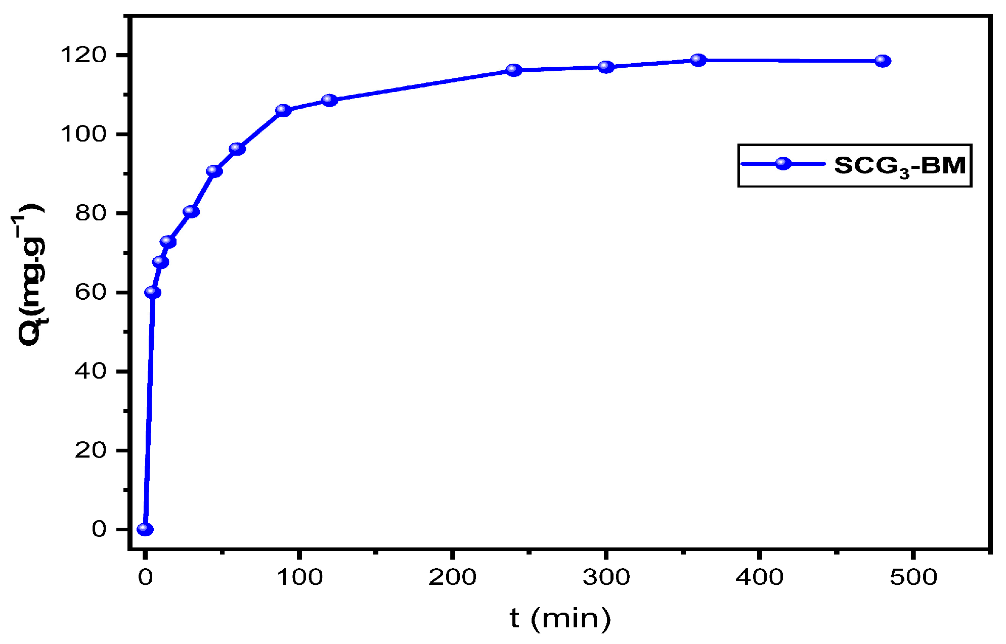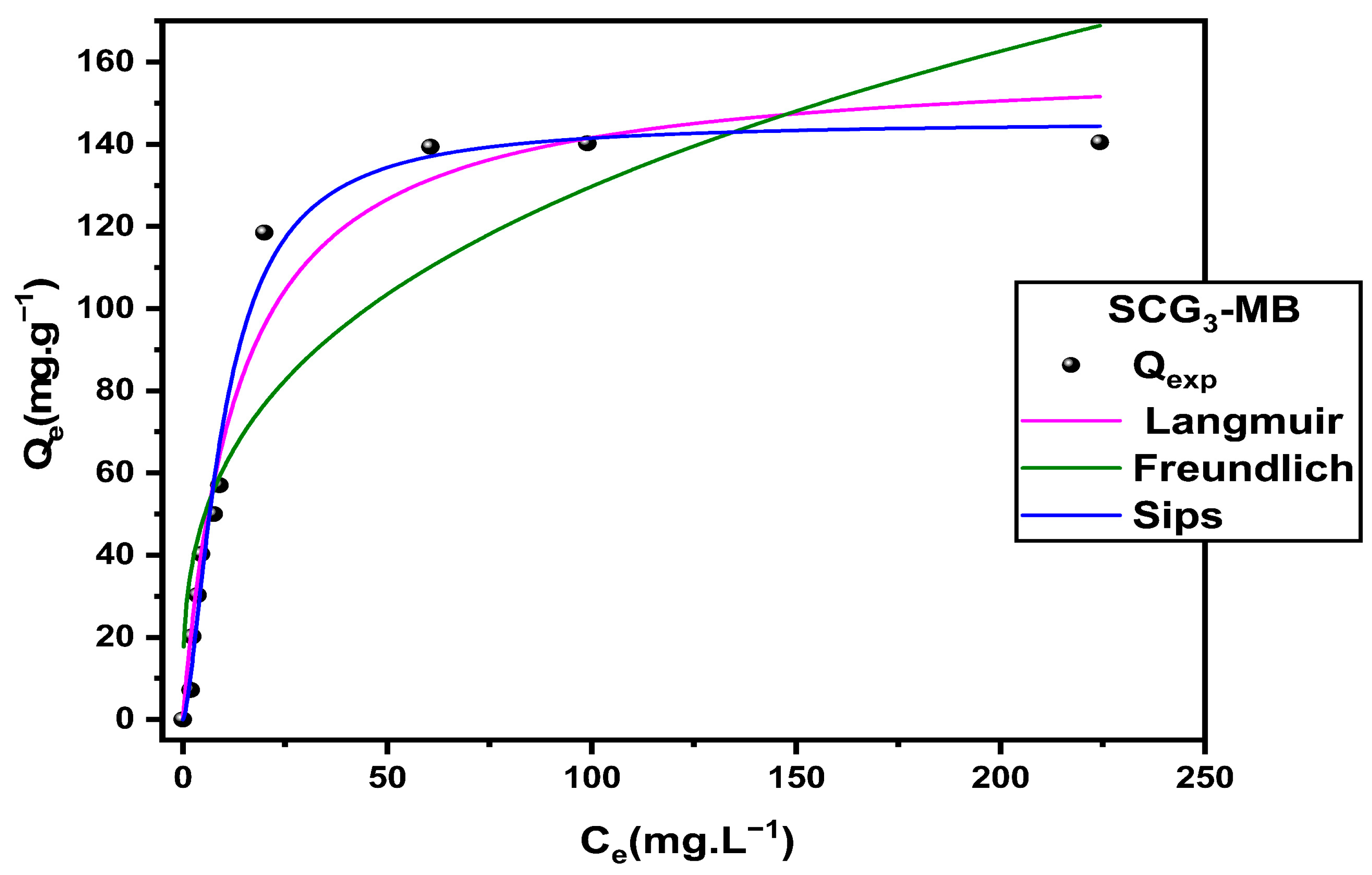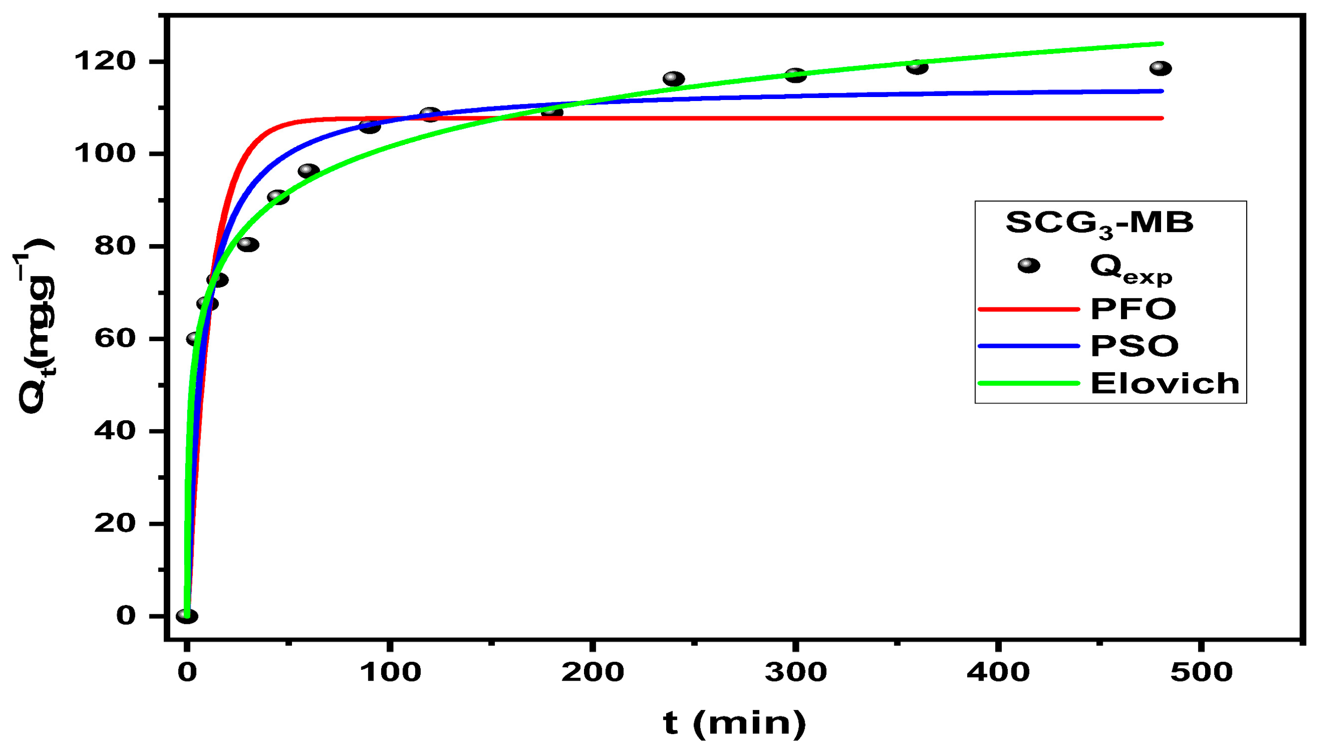 3.3. Evaluation of the MB Adsorption Performance onto SCG3