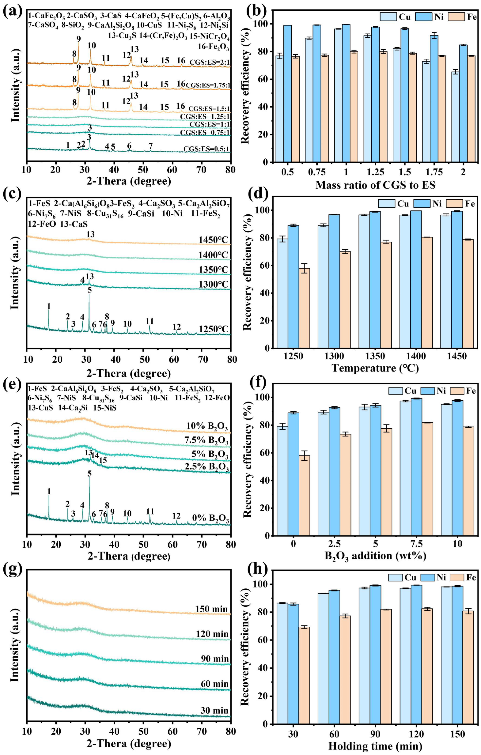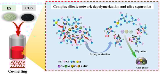 - When ES and CGS were co-melted at a mass ratio of 1:1 with 7.5 wt% B2O3 at 1250 °C for 90 min, vitrification was achieved, and 97.3% Cu, 99.2% Ni, and 81.8% Fe were simultaneously recovered.