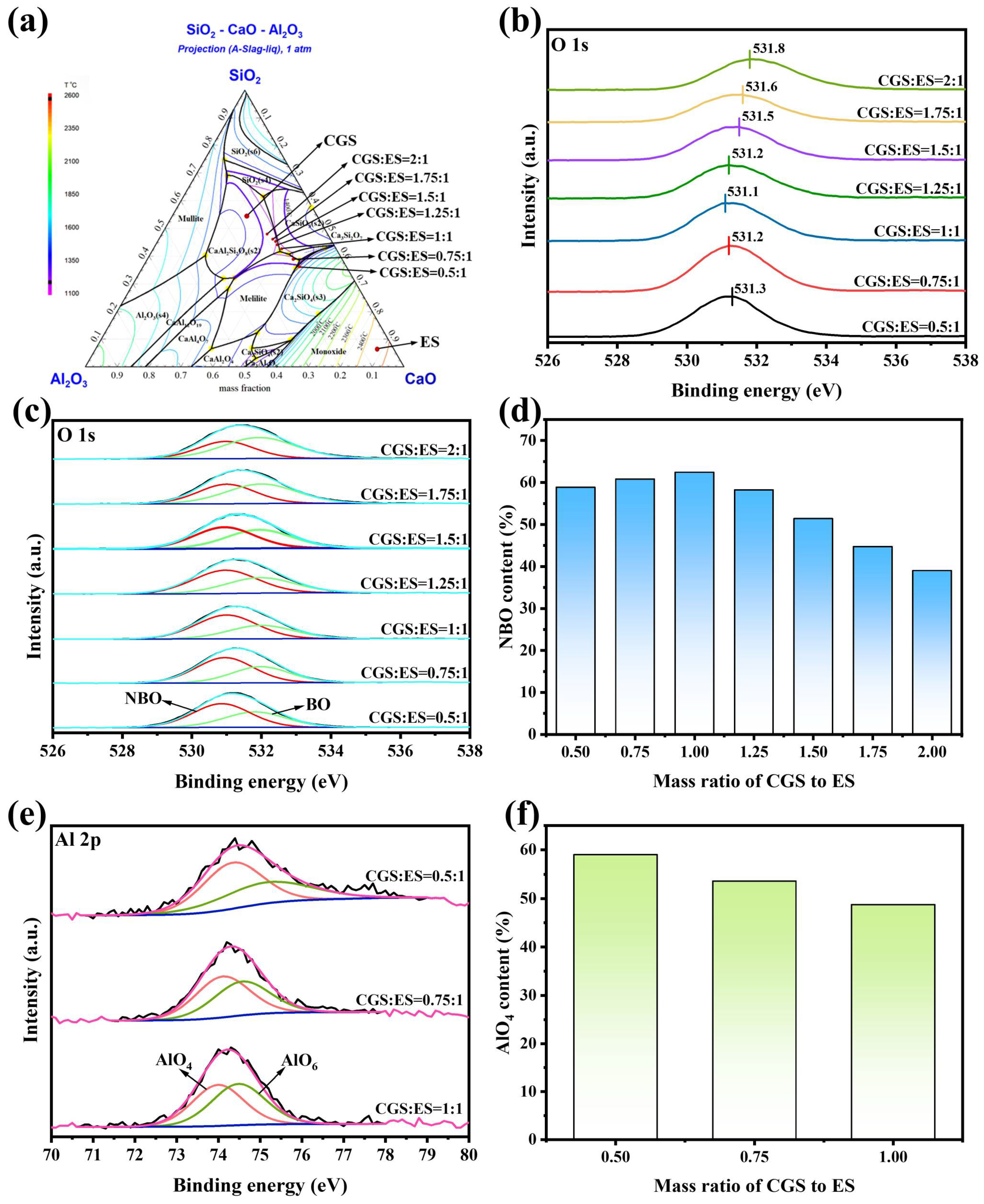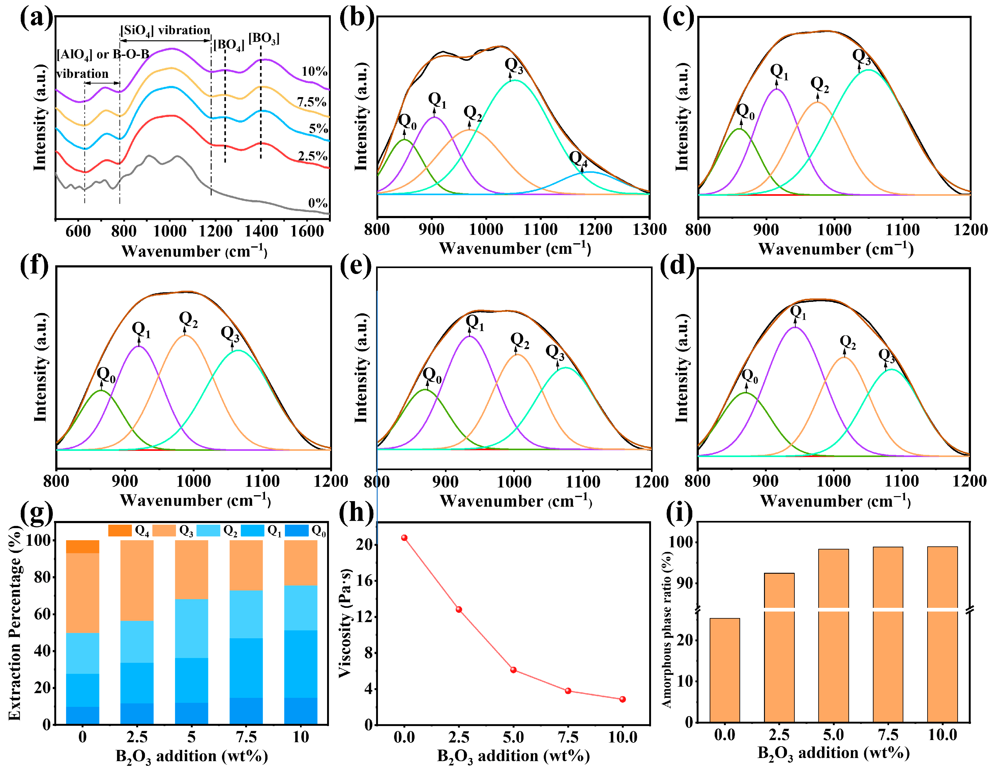 - The synergistic mechanism of CaO, Al2O3, and B2O3 in the silicate network was investigated through characterization. Active species CaO, [AlO6], and [BO3] promoted the depolymerization of the complex Si-O network structure, thereby facilitating crystal phase melting and enhancing melt fluidity.