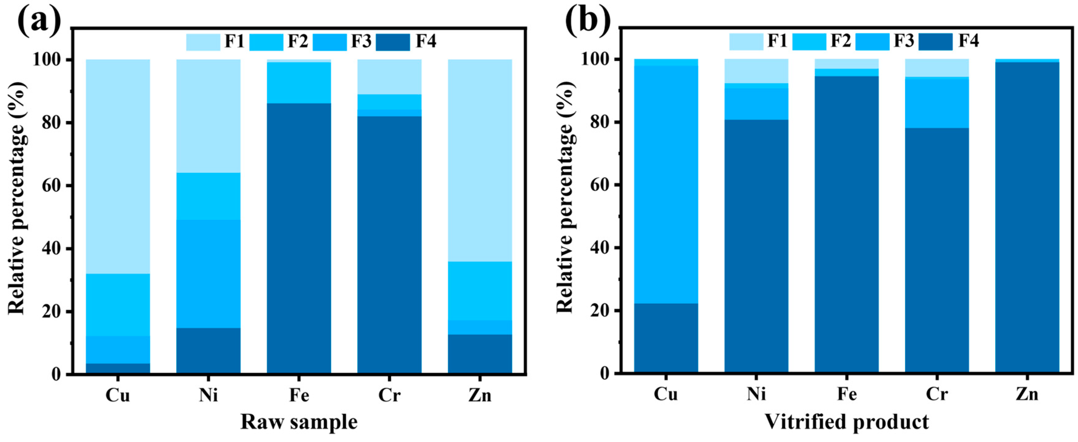 - Residual heavy metals such as Cu, Ni, Cr, and Zn in the vitrified product were effectively immobilized, and a high-performance glass-ceramic was prepared by heat-treating the vitrified product at 850 °C for 120 min.