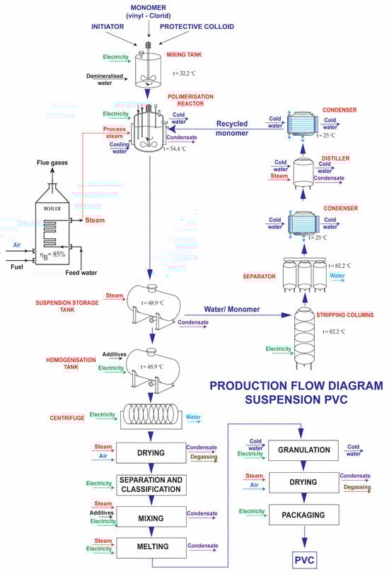 The remaining PVC suspension is separated further into a storage tank, then into a de-monomerization system, since it still contains up to 5% vinyl-chloride monomer. The monomerized suspension is stored in tanks for homogenization of the suspension, then centrifuged and, with a moisture content of about 25%, sent to a dryer, where it is dried with a stream of hot air. Then, it follows the procedure of separation and processing and packaging. The waste suspension is treated in a wastewater treatment plant or recycled back into the process [5,25,26]. The general flow diagram of suspension-PVC production is shown in Figure 4.