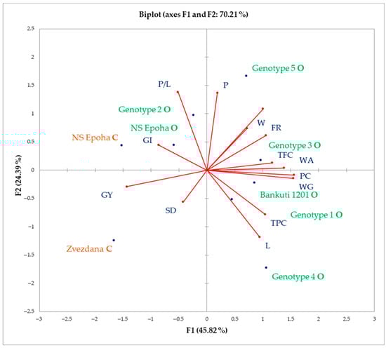 PCA biplot of the physicochemical, rheological behaviour, and antioxidant properties of wheat grains. Red dots depict examined properties whereas blue dots depict wheat genotypes. The names of wheat genotypes written in green are from organic farming, whereas the names of wheat genotypes written in orange are from conventional farming.