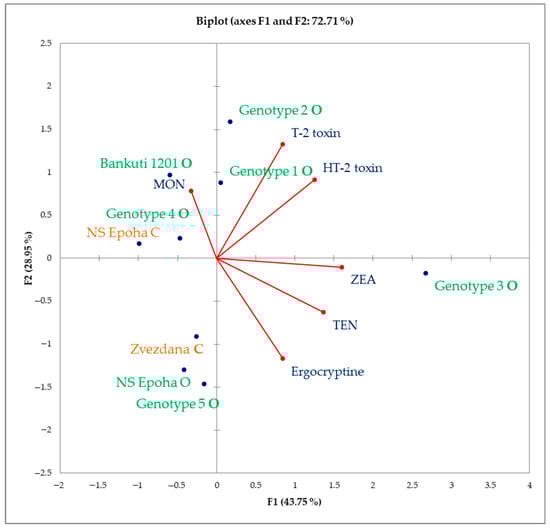 PCA biplot of wheat cultivars based on mycotoxin profiles. Red dots depict mycotoxins, whereas blue dots depict wheat genotypes. The names of wheat genotypes written in green are from organic farming, whereas the names of wheat genotypes written in orange are from conventional farming.
