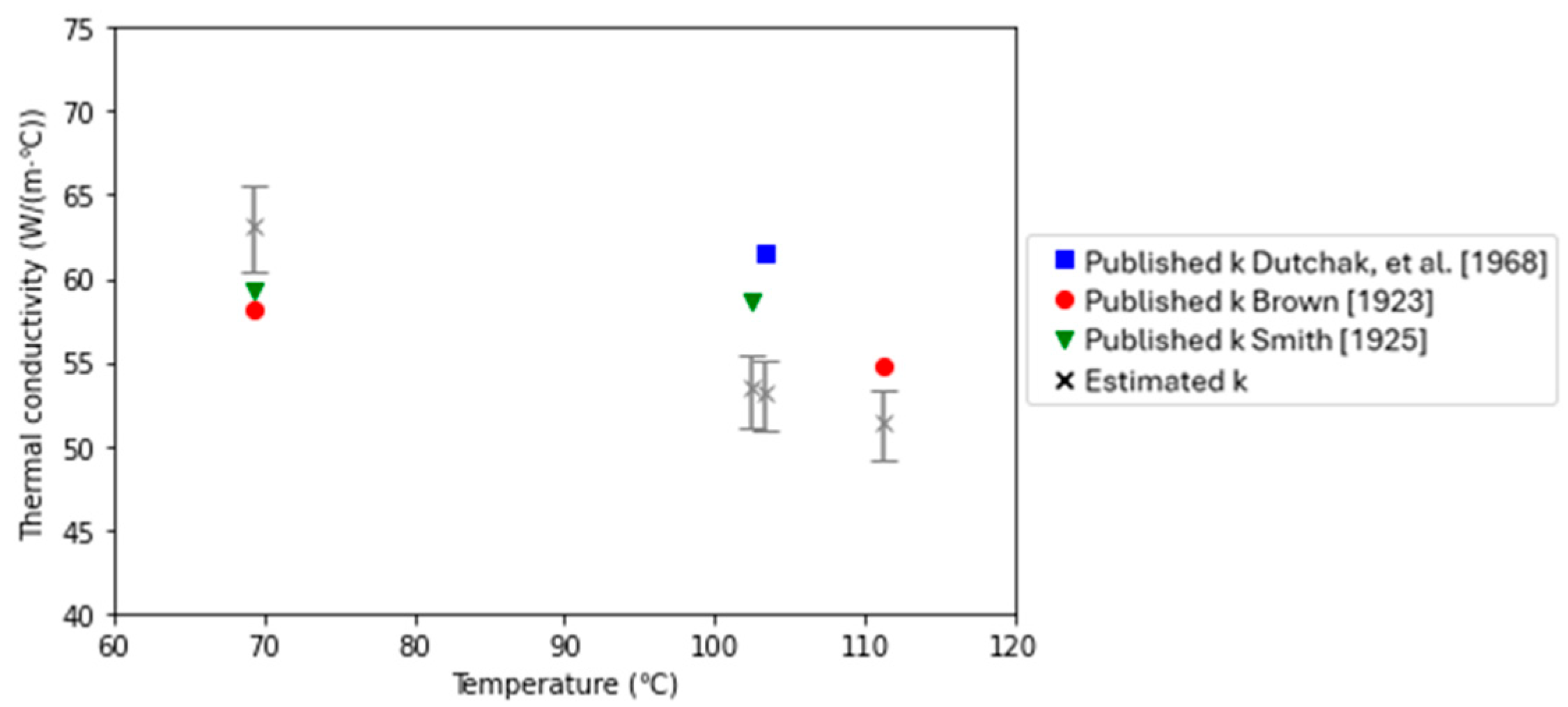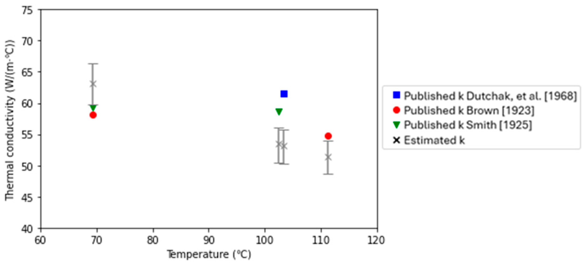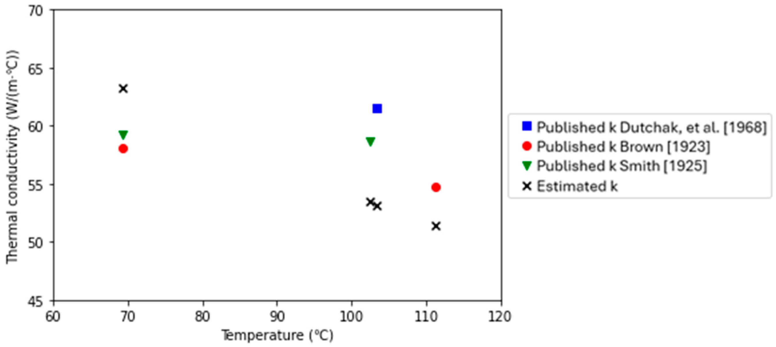 - Smith, A.W. Thermal Conductivities of Alloys; Ohio State University Engineering Experiment Station: Columbus, OH, USA, 1925; Bulletin No. 31; Available online: https://primo.pugetsound.edu/discovery/fulldisplay?docid=alma99150740460001451&context=L&vid=01ALLIANCE_UPUGS:UPUGS&lang=en&search_scope=Everything&adaptor=Local%20Search%20Engine&tab=Everything&query=title,exact,The%20Ohio%20State%20University,%20the%20Engineering%20Experiment%20Station.%20Bulletin%20no.%2030.%20%5Bi.e.%2031%5D%20October%2015,%201925.%20%5BEngineering%20series%5D,AND&mode=advanced&offset=0 (accessed on 2 December 2025).