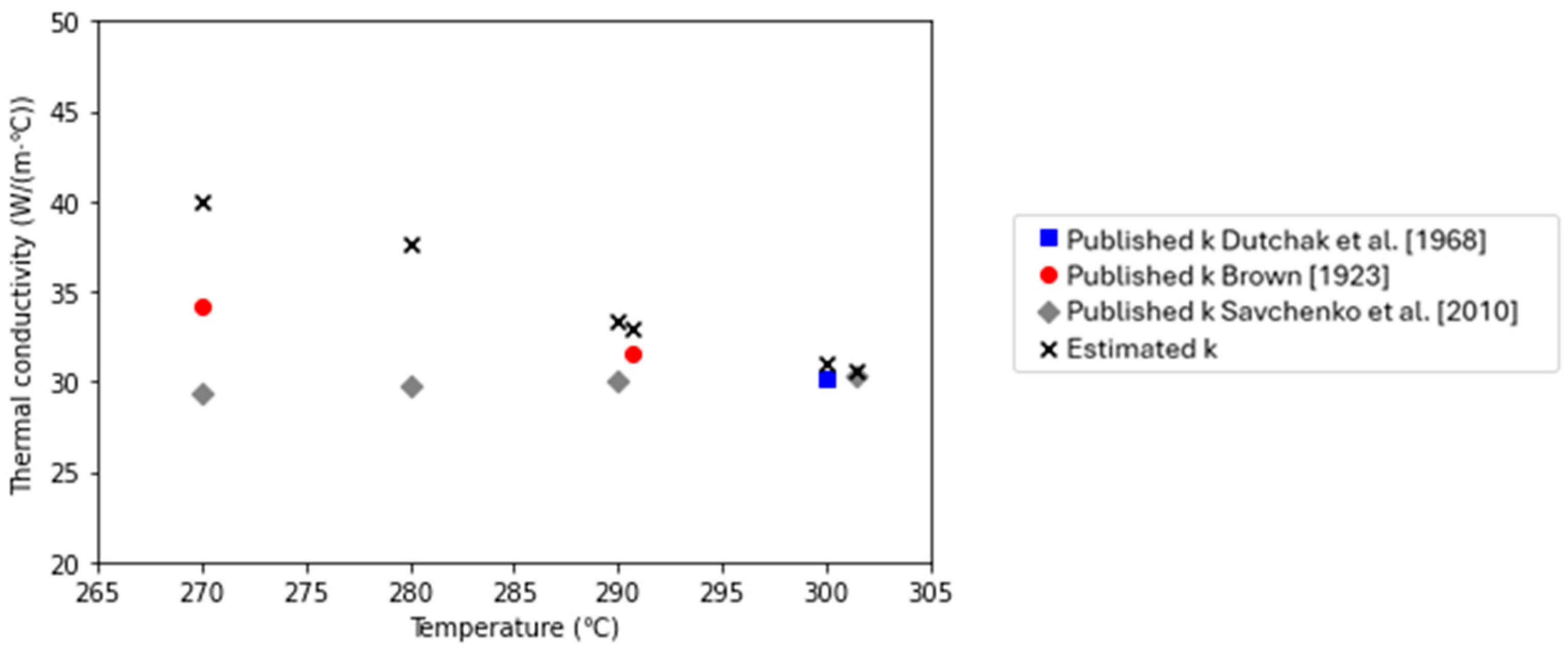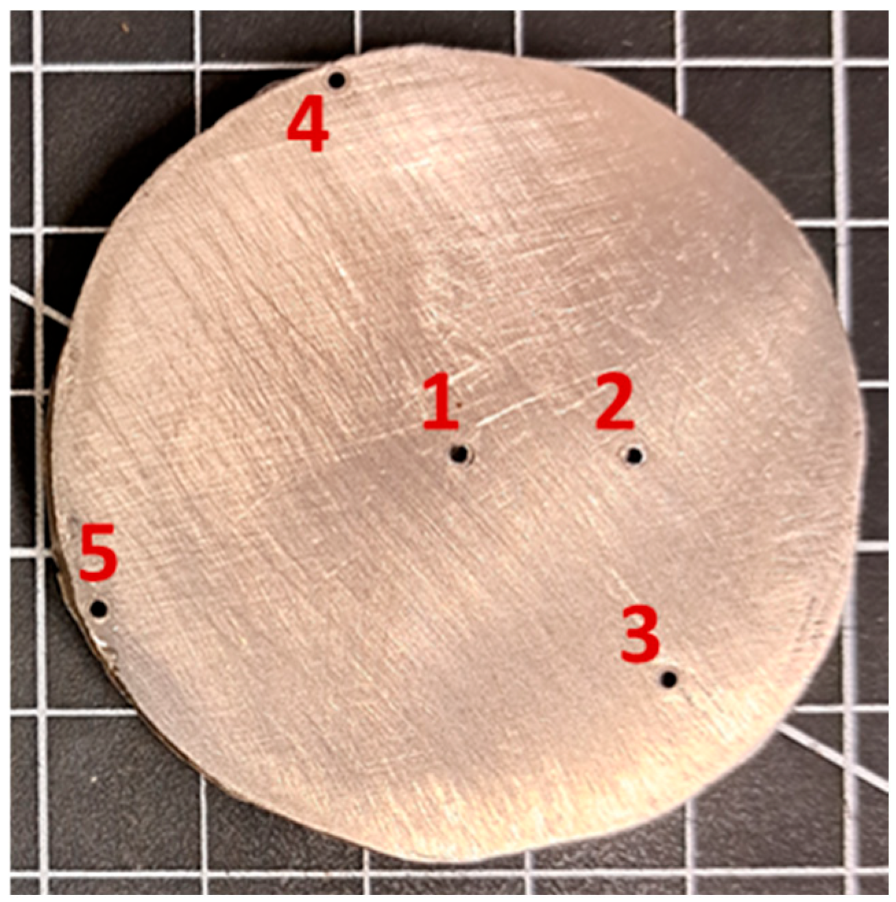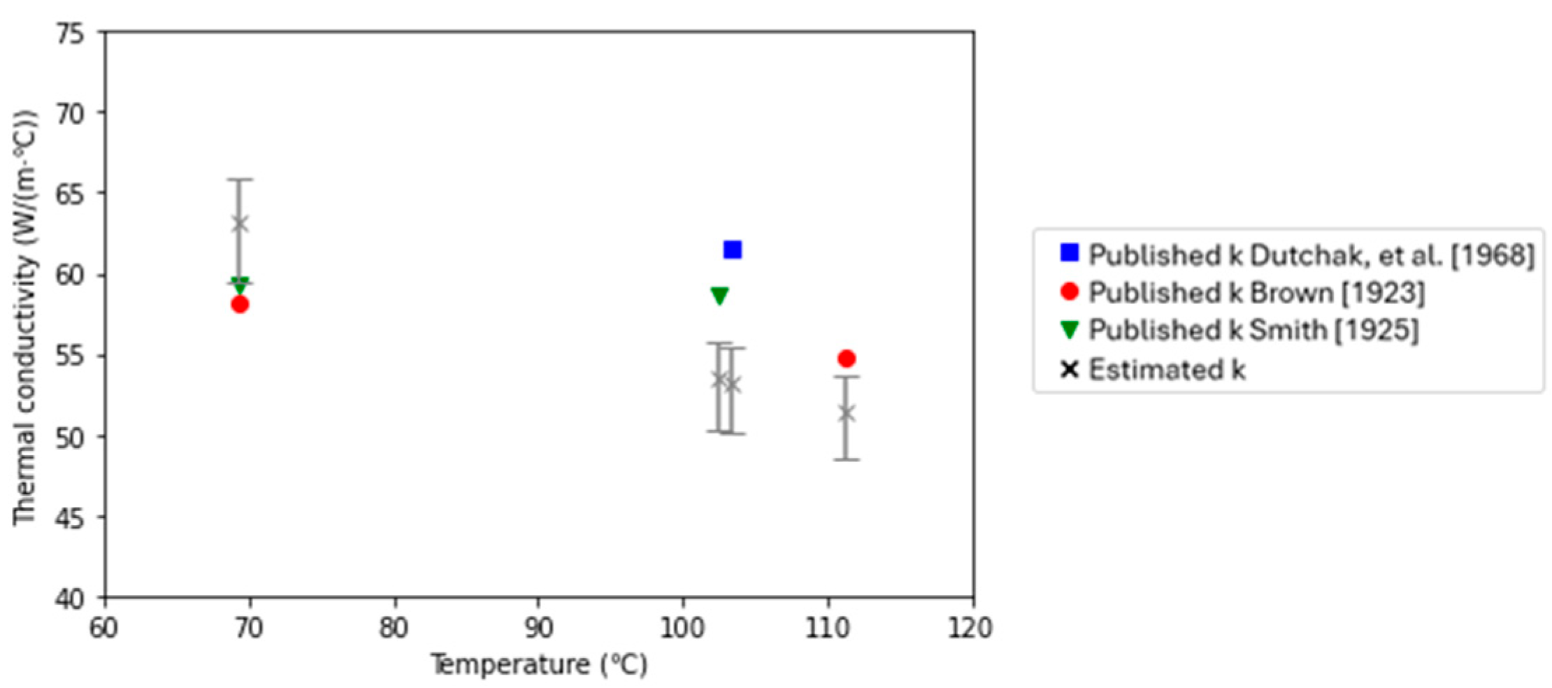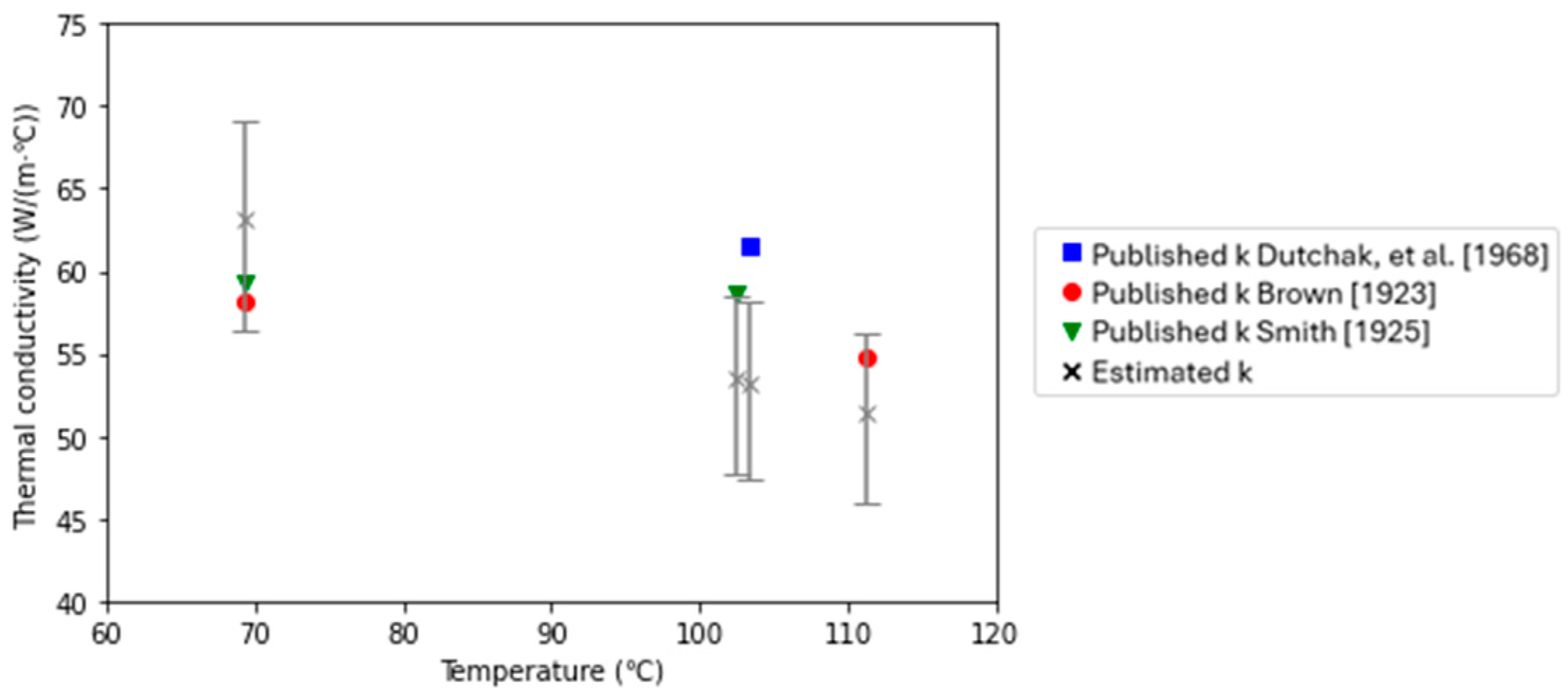 - Smith, A.W. Thermal Conductivities of Alloys; Ohio State University Engineering Experiment Station: Columbus, OH, USA, 1925; Bulletin No. 31; Available online: https://primo.pugetsound.edu/discovery/fulldisplay?docid=alma99150740460001451&context=L&vid=01ALLIANCE_UPUGS:UPUGS&lang=en&search_scope=Everything&adaptor=Local%20Search%20Engine&tab=Everything&query=title,exact,The%20Ohio%20State%20University,%20the%20Engineering%20Experiment%20Station.%20Bulletin%20no.%2030.%20%5Bi.e.%2031%5D%20October%2015,%201925.%20%5BEngineering%20series%5D,AND&mode=advanced&offset=0 (accessed on 2 December 2025).