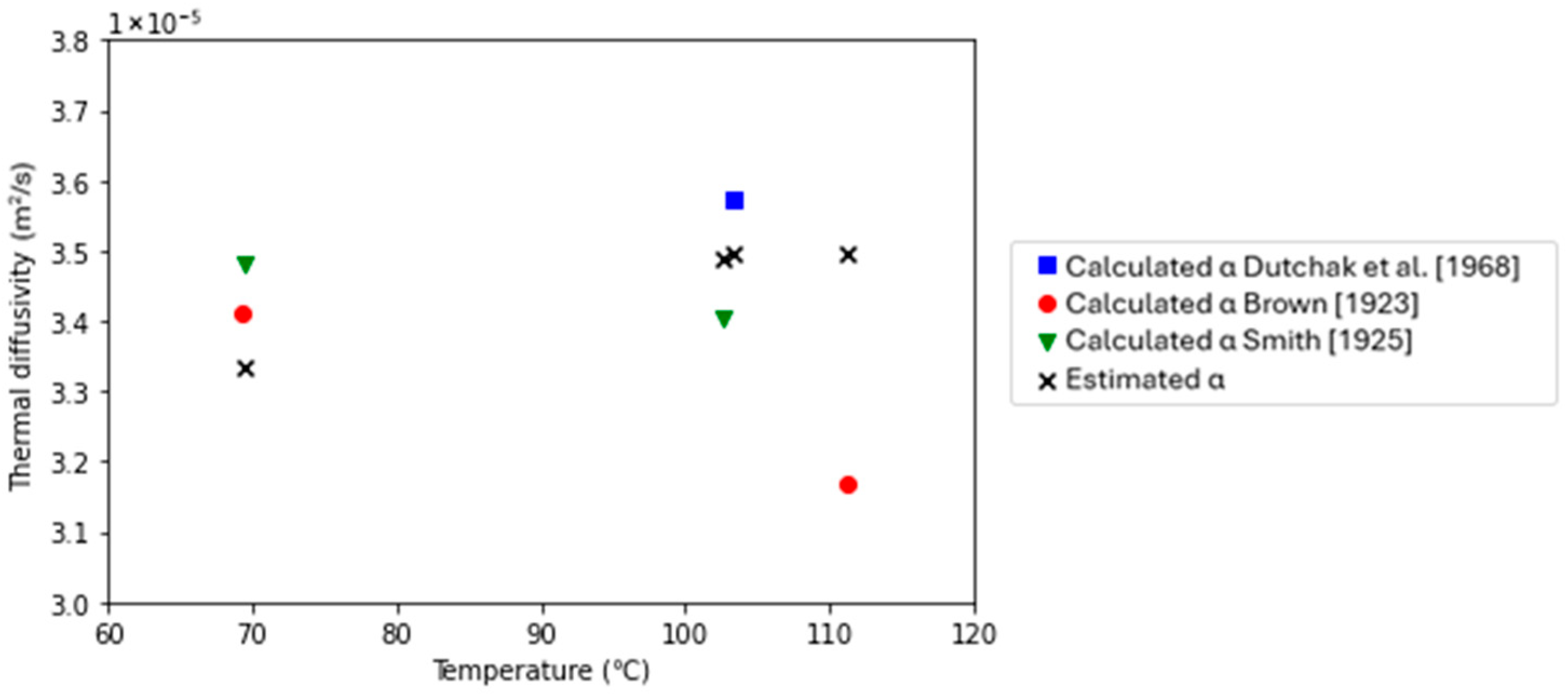 | Temperature °C | Ref. Number | Av. α_Ref. m2/s | α_Est. m2/s | Difference % |