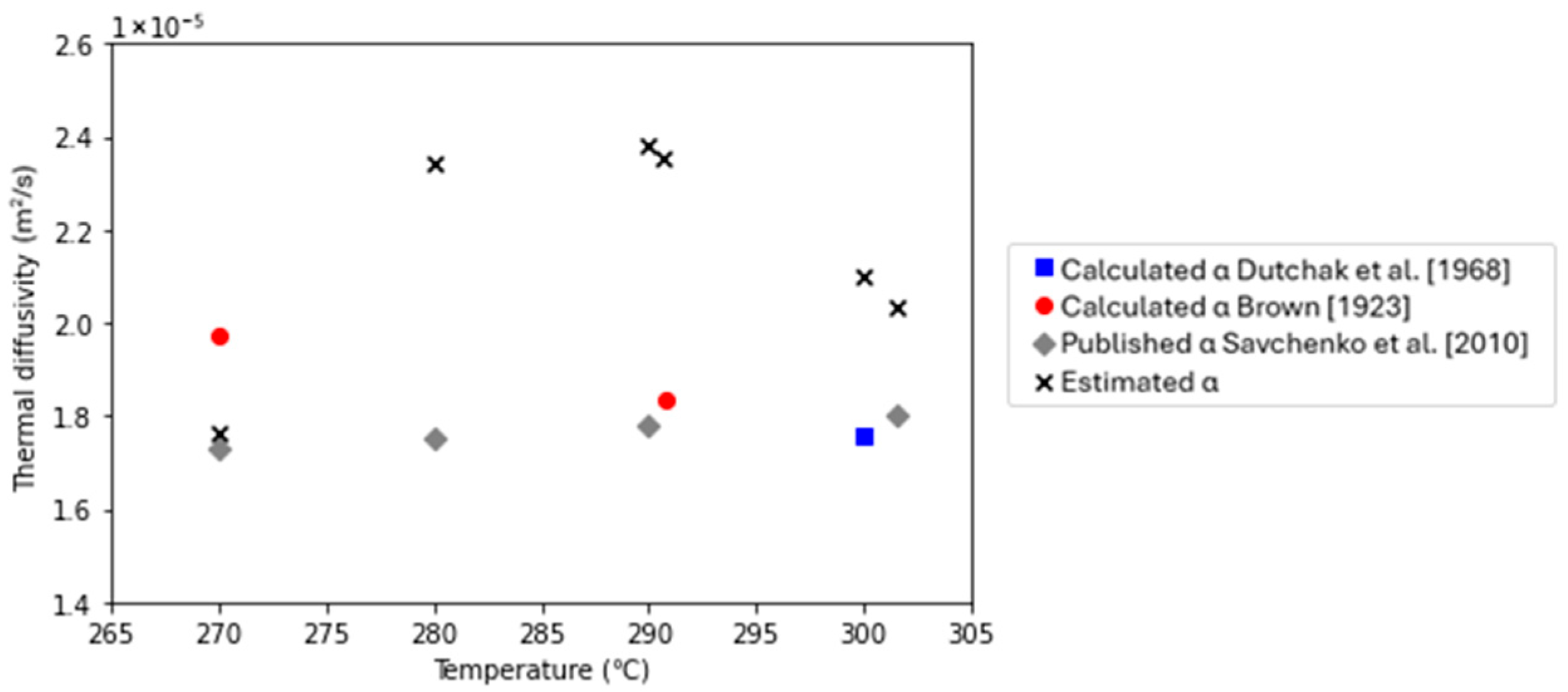 4.2. Estimation of Thermal Conductivity and Thermal Diffusivity for the Liquid Phase