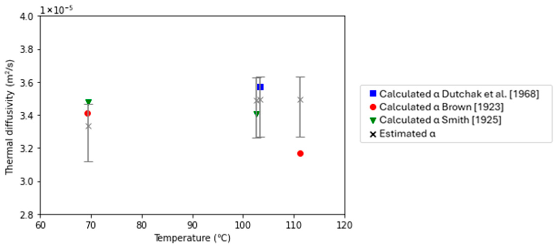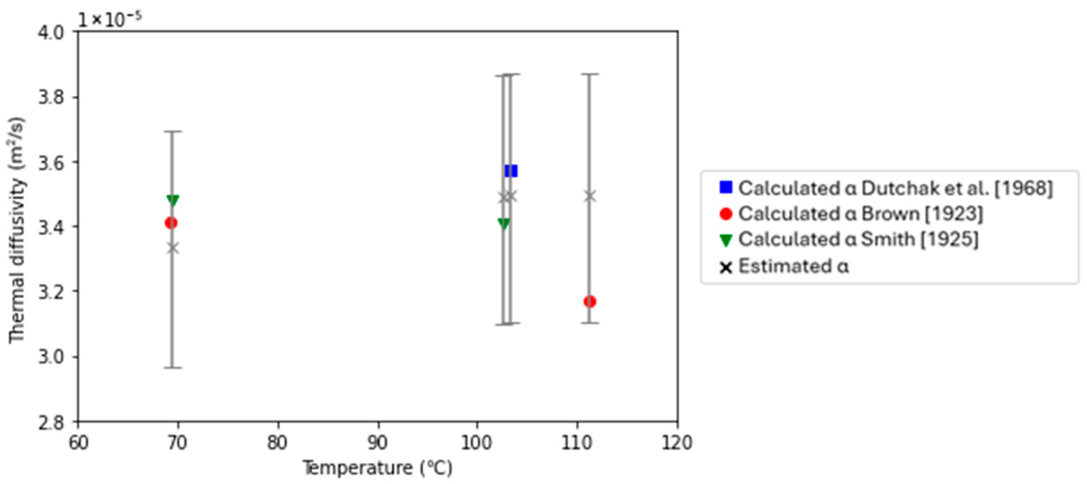 4.1. Estimation of Thermal Conductivity and Thermal Diffusivity for the Solid Phase
