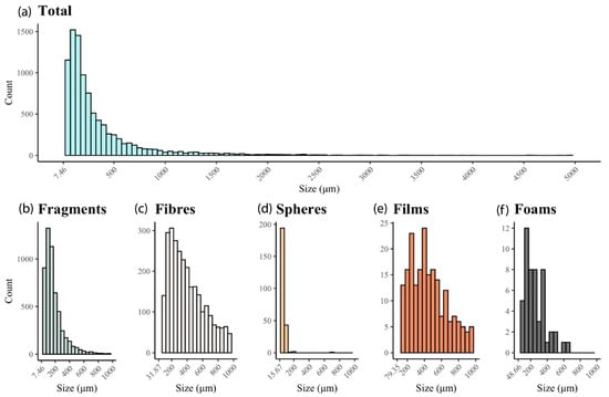 Size distribution of (a) total microplastics (n = 9532), including (b) fragments (n = 5494), (c) fibers (n = 3502), (d) spheres (n = 247), (e) films (n = 236), and (f) foams (n = 53), identified in biosolid samples collected across Southern Ontario, Canada. Reprinted from Letwin et al. (2023) [13] with permission from the publisher.
