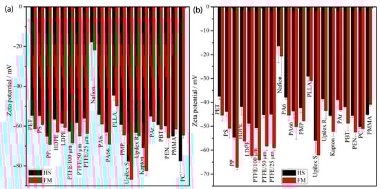 Zeta potential of (a) 21 polymer foils measured in 0.001 mol/L and (b) 0.005 mol/L KCl electrolyte, both calculated using the Helmholtz–Smoluchowski (HS, black) and Fairbrother–Mastin (FM, red) equations. Reprinted from Kolská et al. (2013) [31] with permission from the publisher.