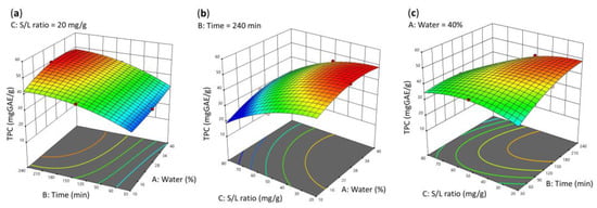 RSM plots for the TPC response showing the correlation between TPC and the factors (a) time and % water in the NADES–water system (in a solid-to-liquid ratio of 20 mg/g) and (b) solid-to-liquid ratio and % water in the NADES–water system (for extraction time = 240 min), and (c) solid-to-liquid ratio and time (for 40% of water in the NADES–water system).