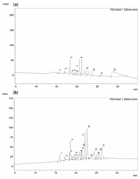 (a) Chromatogram of NADES-extract. Identified peaks: 1. Chlorogenic acid, 2. Syringic acid, 3. Coumaric acid, 4. Ferullic Acid, 5. Naringin, 6. Benzoic acid, 7. Resveratrol, 8. Salicylic acid, 9. Cinnamic acid, 10. Hesperetin, 11. Apigenin, 12. Unknown. (b) Chromatogram of hydroethanolic extract. Identified peaks: 1. Vanillinic acid, 2. Vanillin, 3. Unidentified, 4. Coumaric acid, 5. Ferullic Acid, 6. Naringin, 7. Rosmarinic acid, 8. Salicylic acid, 9–11. Unidentified, 12. Cinnamic acid, 13. Hesperetin, 14–16. Unknown, 17. Apigenin.
