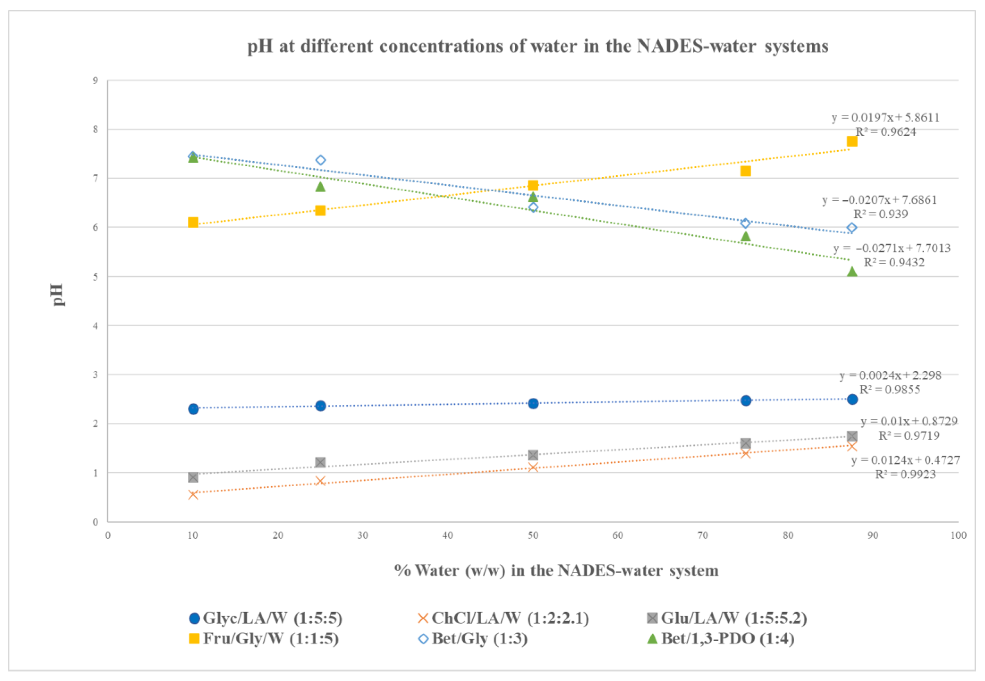Figure 2 show that the three NADESs that contain lactic acid have a strong acidic character (pH). A slight increase in the pH is observed with increasing amounts of water in the NADES system, as is also mentioned by Pozharitskaya et al. and Mitar et al. [