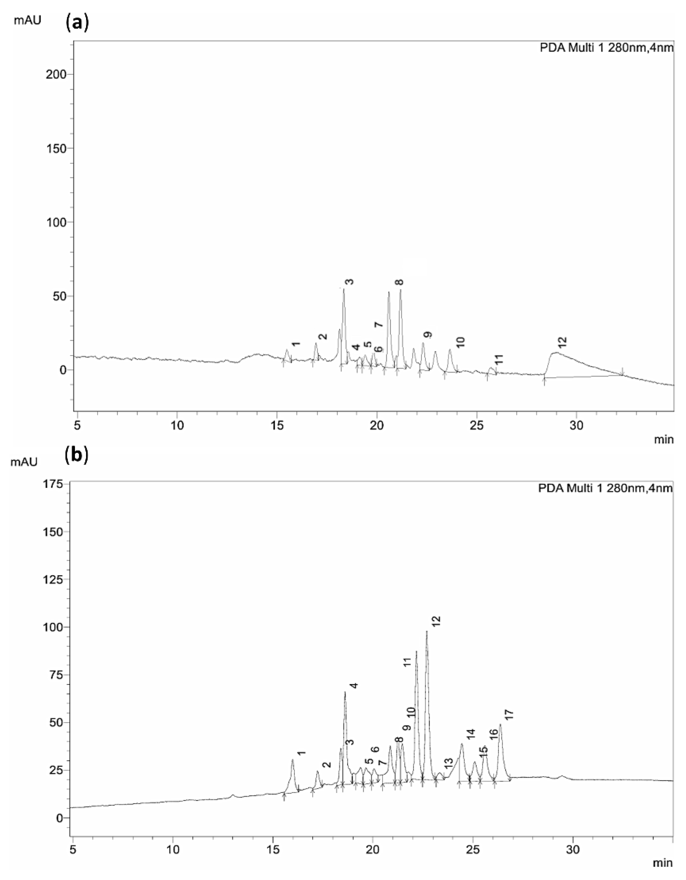 Figure 5a,b). The conducted analysis targeted common phenolic compounds for which reference standards were available, employing a developed library of 22 reference standards. The corresponding chromatographs and identified compounds of this analysis are presented in