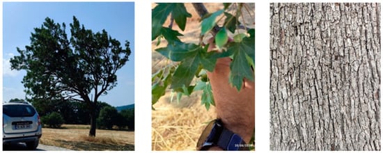All the sampled trees were healthy, and free from any visible disease or mechanical damage. The trees were naturally grown, solitary, and mixed with other trees such as Pinus brutia and Quercus cerris. The trees were approximately 40 years old with an average diameter at breast height (1.3 m) of approximately 30 cm (Figure 1). The bark samples were collected from the trees at approximately breast height by cutting small squares of bark (about 5 × 5 cm) with a sharp chisel and carefully removing them from the stem wood. The bark thickness was approximately 1 cm. The samples were air-dried and shipped to Lisbon and Izmir for subsequent chemical analyses at the University of Lisbon and Izmir Institute of Technology, respectively.