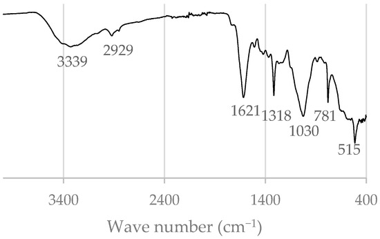 The FTIR spectrum of E. trilobatus bark (Figure 3) confirms the coexistence of organic and inorganic constituents within the material. The strong absorption bands at 1621, 1318, 781, and 515 cm−1 are characteristic of C–O stretching vibrations in calcium oxalate, corroborating the SEM–EDS evidence of Ca-rich inclusions and the high ash content determined by wet chemical analysis [47]. These features support the interpretation that calcium oxalate crystals represent a major inorganic component naturally embedded in the bark tissue. A broad absorption band is observed with a maximum at 3339 cm−1, which is assigned to O-H stretching in cellulose, hemicelluloses, lignin and phenolic extractives. A weak band at 2929 cm−1 and a small peak at 2854 cm−1 correspond to asymmetrical and symmetrical CH2 stretching in aliphatic long-chain groups of extractives and suberin that are present with only small contents (4.0% suberin and 2.5% DCM extractives, Table 1). Additionally, the very small peak at 1730 cm−1 corresponds to absorption of C=O ester groups that are characteristic of suberin [47]. The broad band observed with a maximum at 1030 cm−1 is associated with C-O stretching in cellulose and hemicelluloses, reflecting the significant polysaccharide fraction (45.7% dry bark, Table 1). The absorption of C-C stretch in aromatic rings present in lignin is represented by small and undefined peaks at 1510 cm−1, 1607 cm−1 and 1420 cm−1, as well as at 1461 cm−1 (methoxy group).