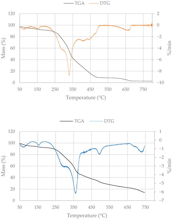 The thermal behavior of E. trilobatus bark under oxidative (air) and inert (N2) atmospheres is shown in Figure 4. In both conditions, decomposition occurs in four main stages, although the degradation pathways and residual masses differ according to the atmosphere. The first stage, up to 310–320 °C, is associated with the release of moisture and volatile extractives, followed by the decomposition of hemicelluloses and part of the amorphous lignin fraction. A shoulder around 300 °C is attributed to extractives and hemicellulose degradation, consistent with the high extractives and polysaccharide contents of the bark. The second stage, between 330 and 360 °C, corresponds to the main mass-loss event and is assigned to cellulose depolymerization. In air, this peak occurs slightly earlier and with higher intensity due to oxidative reactions that accelerate cellulose decomposition, while under N2 it is broader and shifts to higher temperatures, reflecting purely pyrolytic degradation. The third stage, extending beyond 380 °C, represents the slow decomposition of lignin and suberin, together with secondary reactions of char. In air, the residual char is rapidly oxidized, and the final residue corresponds closely to the inorganic ash fraction determined by chemical analysis (13.3%, Table 1). In N2, decomposition continues up to 750 °C, leaving a higher final residue consisting of fixed carbon and inorganic minerals. The fourth stage (670 °C and beyond) possibly corresponds to the thermal decomposition of inorganics. This thermal degradation pattern is consistent with pyrolysis and combustion behavior of barks such as Q. cerris and Betula pendula barks [48] and indicates a heterogeneous thermochemical decomposition behavior.