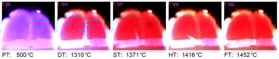 The ash fusion temperature (AFT) defines the temperature range over which the inorganic fraction of the fuel undergoes progressive transformations, beginning with deformation and softening, followed by hemispherical shaping, and ultimately melting into a liquid slag (ASTM D1857) [36]. The characteristic ash fusion temperatures of E. trilobatus bark are summarized in Table 5 and illustrated in Figure 6.