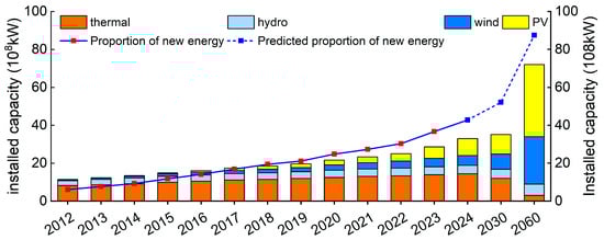 As of the end of 2024, China’s installed wind power capacity reached 520 GW (up 18% year-on-year), and photovoltaic (PV) capacity hit 890 GW (up 45.2% year-on-year) [1], ranking first globally in both metrics. However, this rapid renewable expansion has exacerbated curtailment challenges; regional wind and solar curtailment rates hovered above 20% in 2024 [2], underscoring the urgent need to enhance grid flexibility for new energy accommodation. The evolution of global installed power capacity by source and the proportion of new energy is shown in Figure 1.