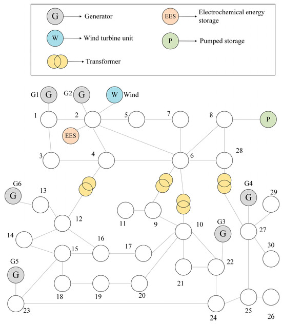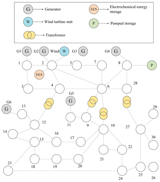 To better verify the optimization of the renewable energy consumption capacity and system operation cost of the proposed method in different power grid environments for the regional power grid, based on the grid structure of the previous case, the placement positions and capacity configurations of conventional units, the capacity configuration and output characteristics of energy storage stations were changed, and this was used as a new example to verify the wide applicability of the proposed method. The topology diagram is shown in Figure 8.