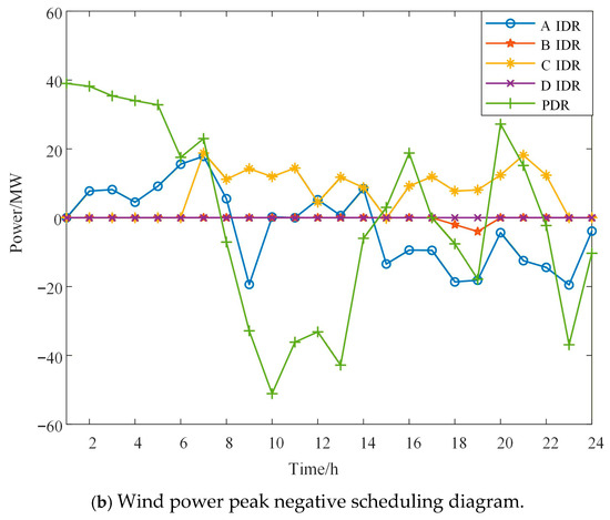 - When wind power is for positive peak shaving, the trend of the wind power output curve is basically consistent with the load curve. The high-output period of wind power is midday (10:00–14:00) and afternoon (16:00–19:00). During this period, the non-demand response load in the system is high, and the amount of IDR resources called is less than that in the negative peak shaving scenario during the same period.
