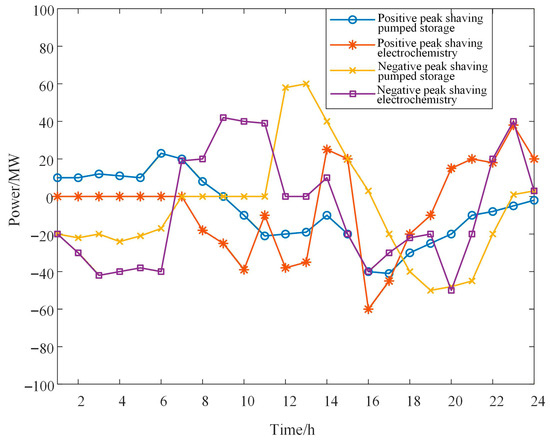 Figure 5 shows the scheduling plans for the two scenarios of positive peak shaving and negative peak shaving of wind power. Each curve represents the total output of the previous curve plus the output of the corresponding unit (or DR resource). Figure 6 shows the DR resource scheduling plans for the two scenarios. Figure 7 shows the scheduling plans for pumped storage power stations and electrochemical power stations in the two scenarios.