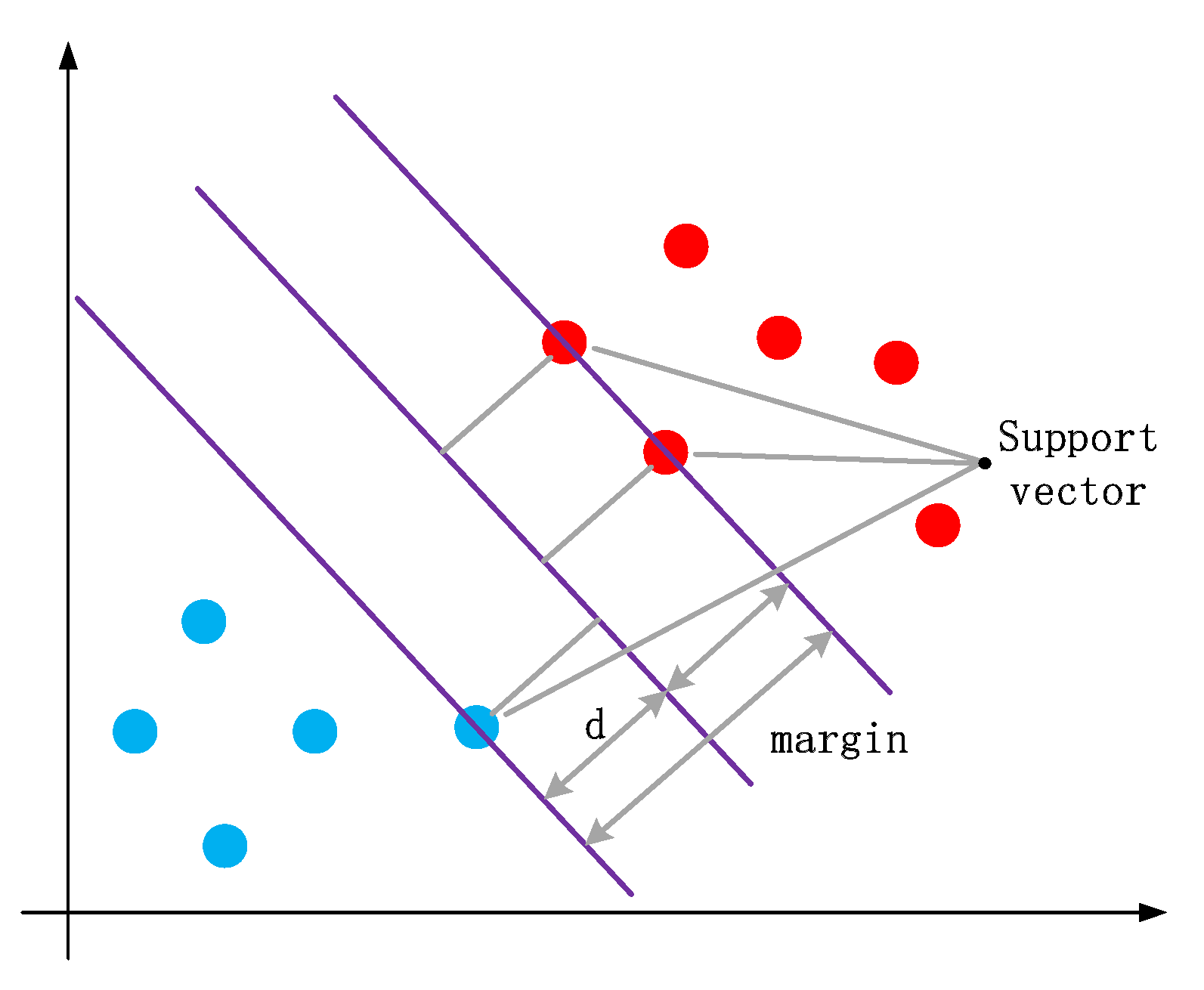 The core principle of SVM is to find an optimal hyperplane that maximally separates data points of different classes in a high-dimensional feature space. This hyperplane is determined by identifying the support vectors—the data points closest to the decision boundary. The objective of the SVM algorithm is to maximize the margin, which is the distance between the hyperplane and the nearest support vector from either class. A schematic of SVM classification is shown in